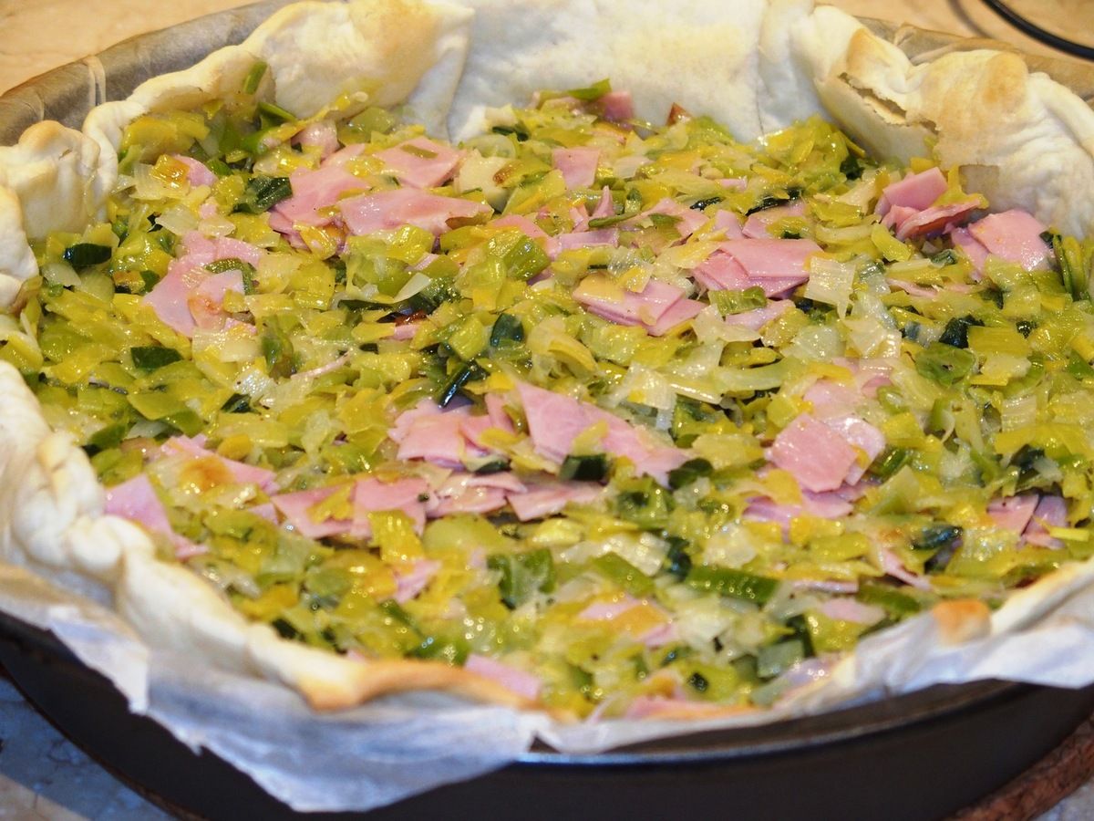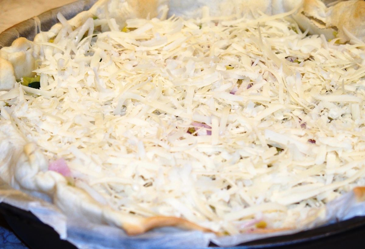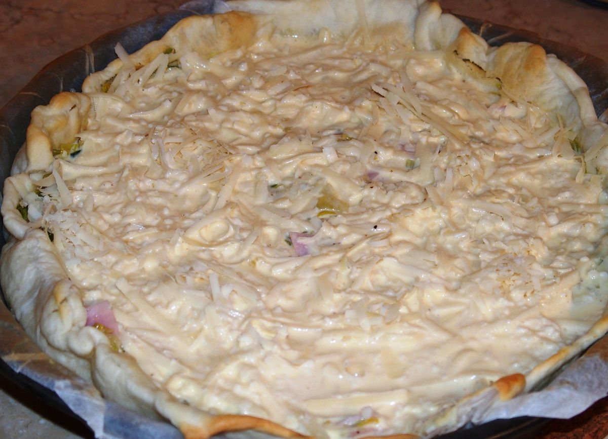 5) Dans la plaque, mettre le mélange poireaux-jambon. Puis recouvrir avec le gruyère. Verser délicatement la liaison et enfourner immédiatement dans le bas du four.