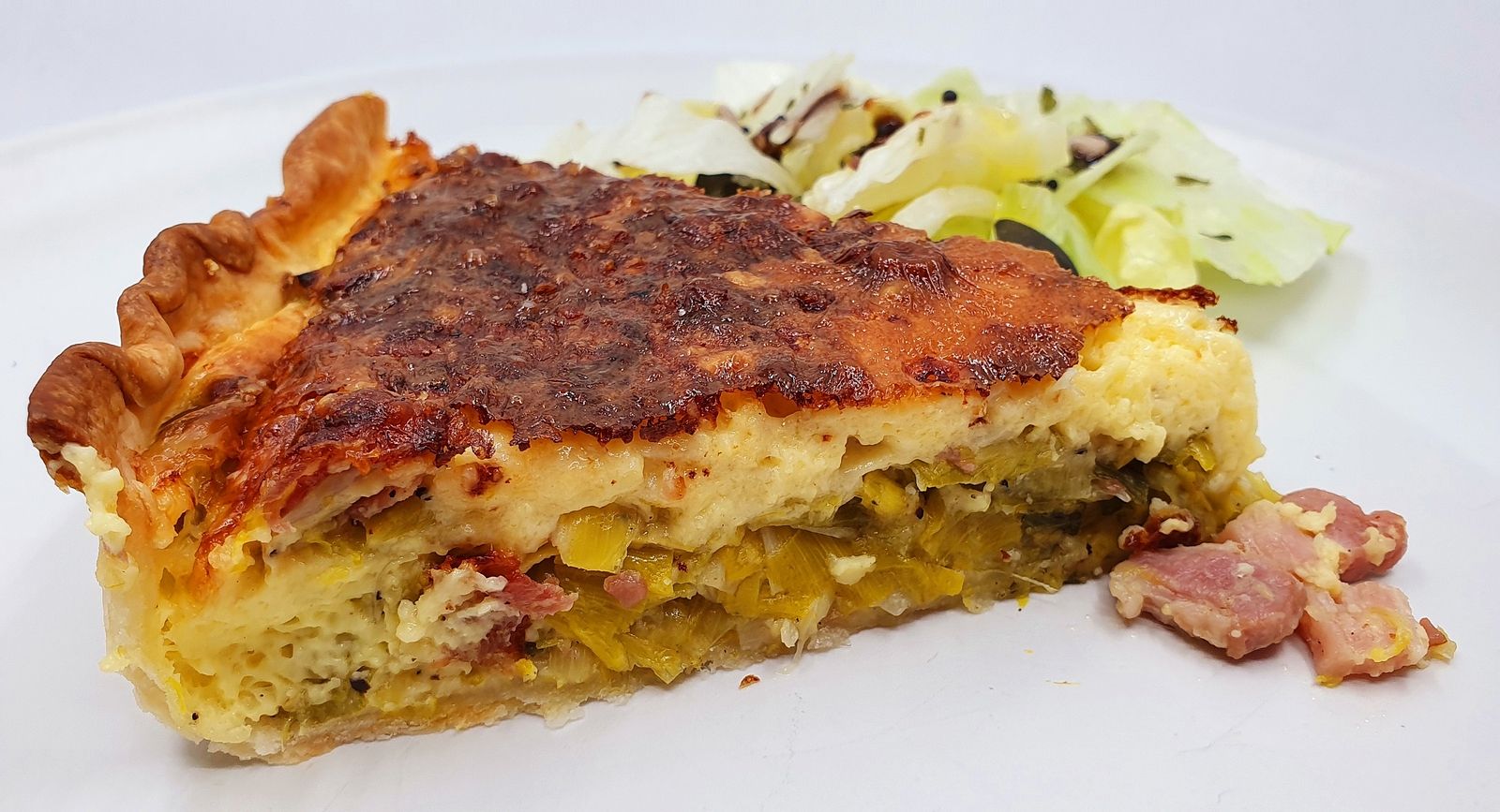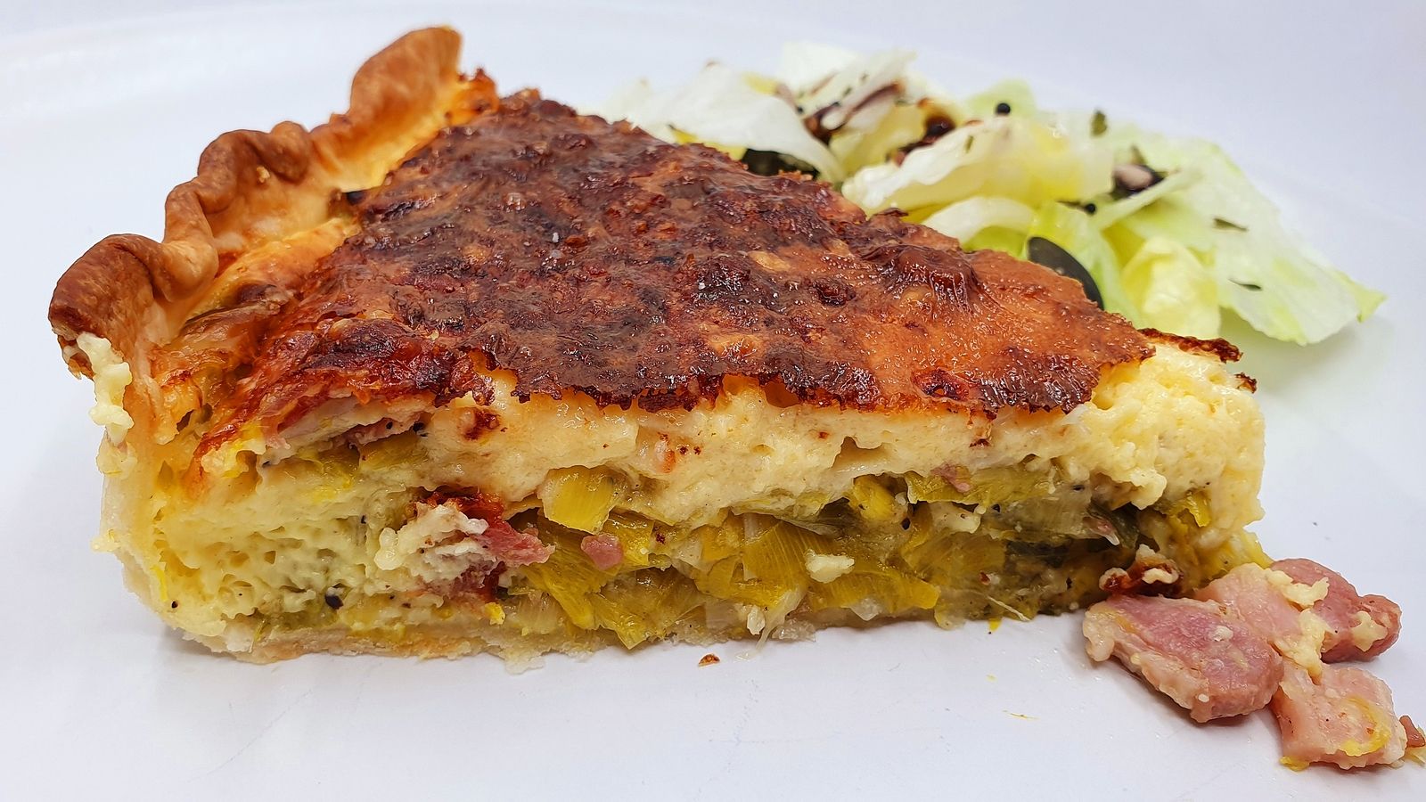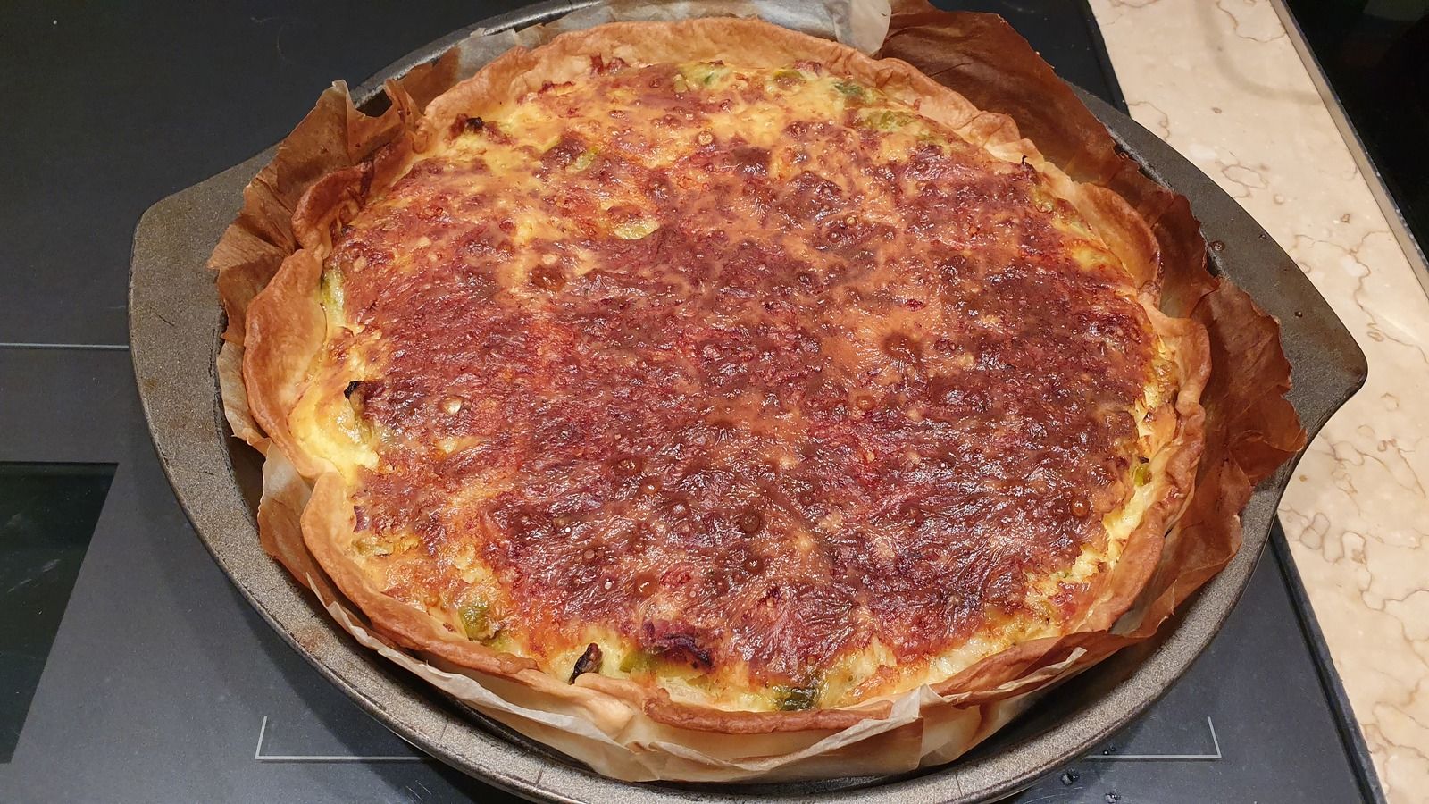 6) Après 30 à 35 minutes, sortir la quiche du four. Laisser reposer 5 minutes, découper de belles tranches et servir avec une salade.