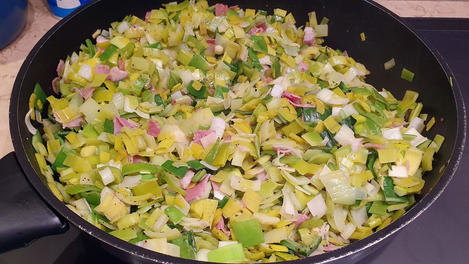 2) Si vous utilisez des lardons, les faire revenir dans une poêle sans matière grasse pendant 2 minutes. Ajouter le beurre et le faire fondre puis faire revenir les poireaux 2 à 3 minutes en mélangeant à découvert. Ajouter le jambon en petits morceaux si vous en utilisez. Saler et poivrer puis couvrir et laisser cuire 10 à 15 minutes jusqu'à ce que les poireaux soient tendres. Ajouter un peu d'eau si nécessaire en cours de cuisson. Lorsqu'ils sont tendres, découvrir. Mélanger et laisser cuire 2 minutes jusqu'à ce qu'il n'y ait plus de liquide du tout. Mettre dans une passoire et laisser tiédir.