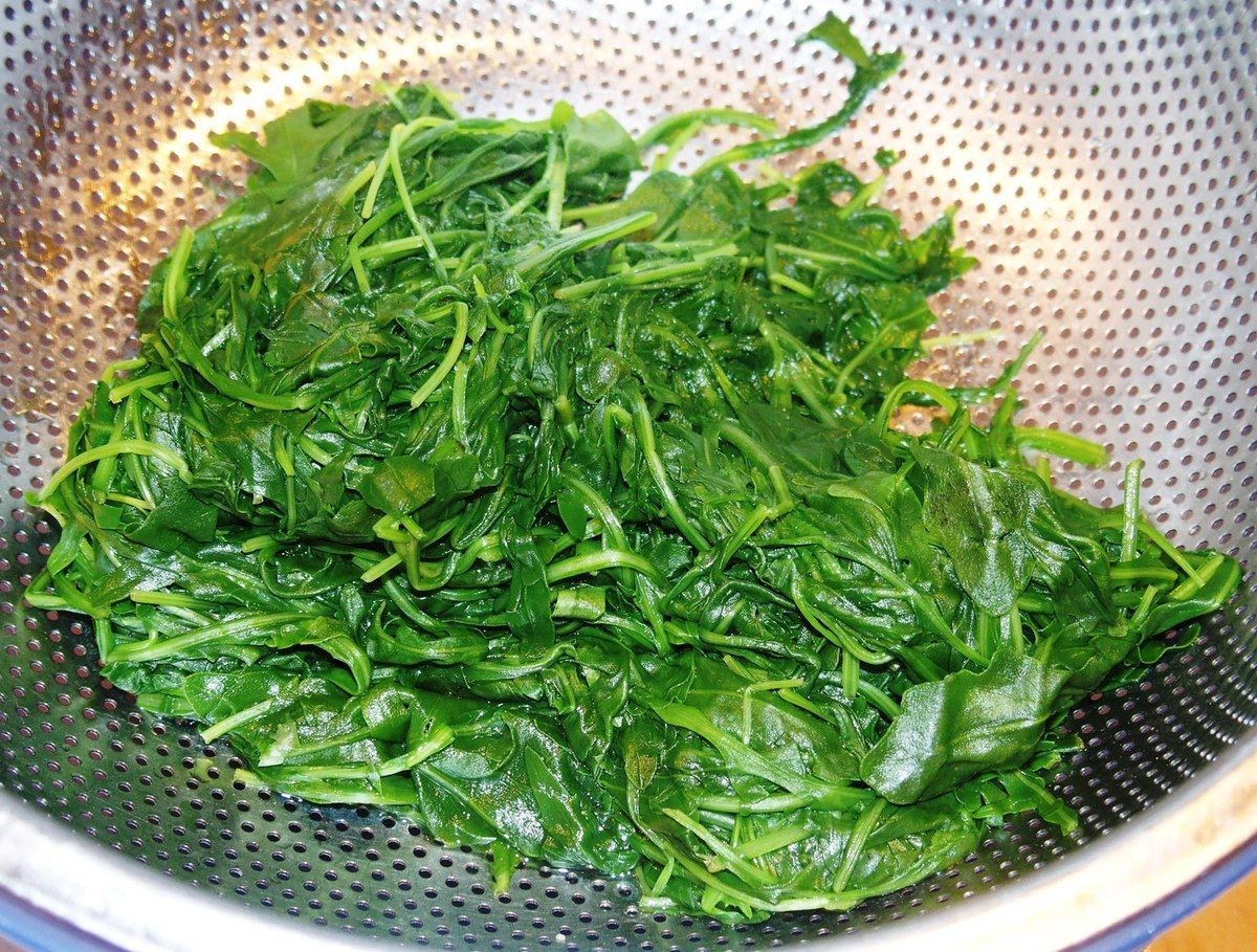 1) Mettre à bouillir de l'eau dans une grande casserole avec du sel. Laver la rucola sous l'eau froide (oui, il y en a beaucoup, mais elle va "tomber"). Mettre de côté une poignée pour la déco. Plonger la rucola dans la casserole et la laisser cuire 5 minutes. Egoutter avec une écumoire et réserver.