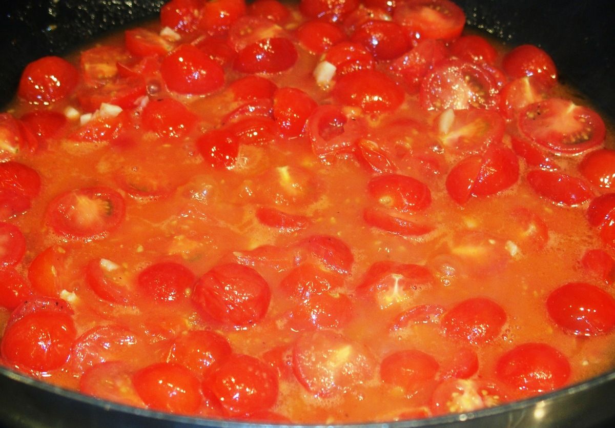 2) Laver et couper les tomates cerises en deux ou d'autres tomates en morceaux. Peler et hacher les gousses d'ail. Dans une grande poêle, mettre un bon filet d'huile d'olive (généreux). Lorsque l'huile est chaude, ajouter l'ail et mélanger une minute à feu moyen. Ajouter les tomates et une pincée de piment en poudre. Saler et poivrer. Laisser compoter environ 10 à 15 minutes en mélangeant sur feu moyen.