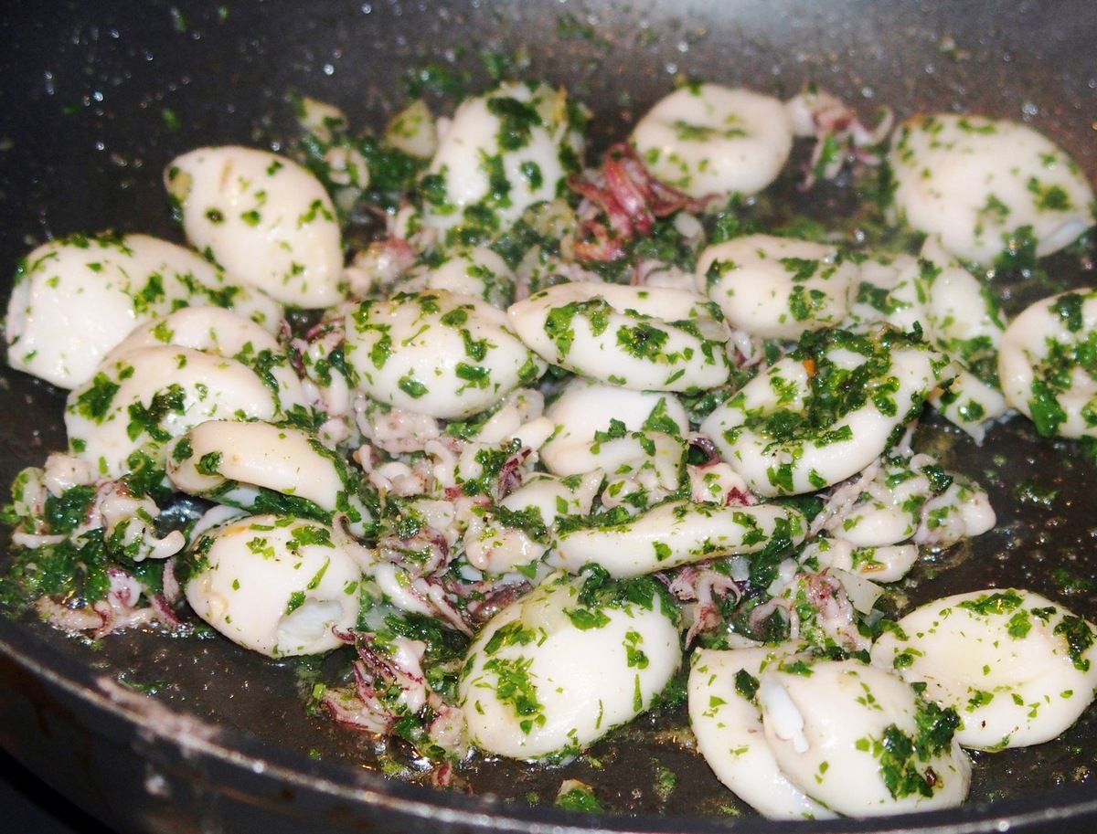 3) Remettre un bon filet d'huile d'olive dans la poêle. Ajouter l'ail et faire revenir une minute à feu moyen. Ajouter les calamars et le persil. Saler et poivrer. Laisser cuire encore 3 à 4 minutes en mélangeant. Servir.