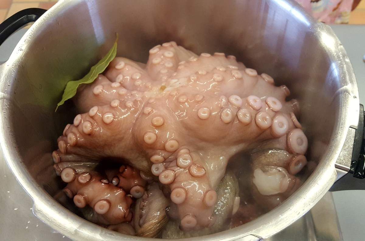 1) Passer le poulpe sous l’eau froide et ôter le bec (vidéo de démo trouvée sur youtube ICI) en le faisant ressortir de la tête. Mettre le poulpe dans une grande casserole. Ajouter la feuille de laurier. Couvrir. Porter à feu moyen-fort. Dès que le poulpe rend de l’eau et qu’elle bout, baisser sur feu doux et laisser cuire à couvert ainsi 1h15. On compte une heure de cuisson pour un poulpe de 1 kilo. Donc 1 h30 pour un poulpe de 1,5 kilo, etc…