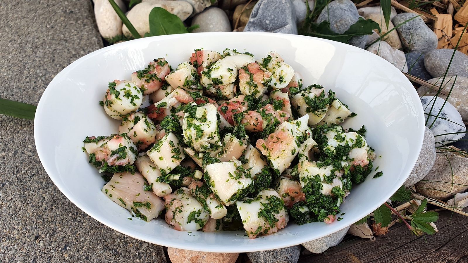 Ah là là comme c'est bon une salade de poulpe faite maison! Réalisée hier avec mes participants à mon cours de cuisine, elle a connu son succès. Et il faut le dire, sa préparation a suscité bien des réactions, des rires et des grimaces. Mais le résultat en valait la peine. Vraiment. Et je vous la recommande.