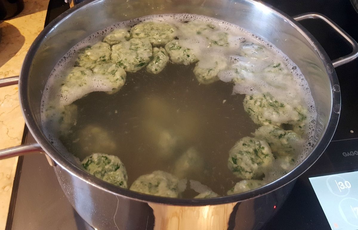 4) Porter à ébullition une casserole d'eau salée. Les plonger par portions dans l'eau frémissante. Compter environ 6 minutes de cuisson depuis qu'ils remontent à la surface. Les égoutter soigneusement à l'aide d'une écumoire et les servir directement dans des assiettes creuses (ils peuvent patienter sur un plat dans le four préchauffé à 70°C le temps de cuire le tout).