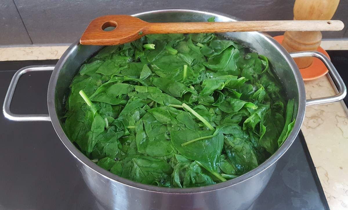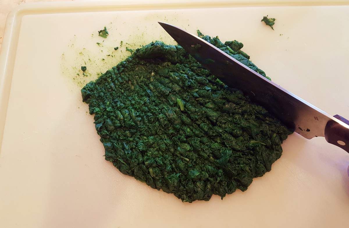 1) Passer les feuilles d'épinards sous l'eau froide. Porter à ébullition de l'eau dans une grande casserole puis y plonger les épinards. Laisser cuire ainsi à frémissements durant 3 minutes en mélangeant. Egoutter les épinards soigneusement et les presser à travers une passoire pour en extraire le maximum d'eau avec une spatule. Les hacher finement avec un couteau et les mettre dans un saladier.
