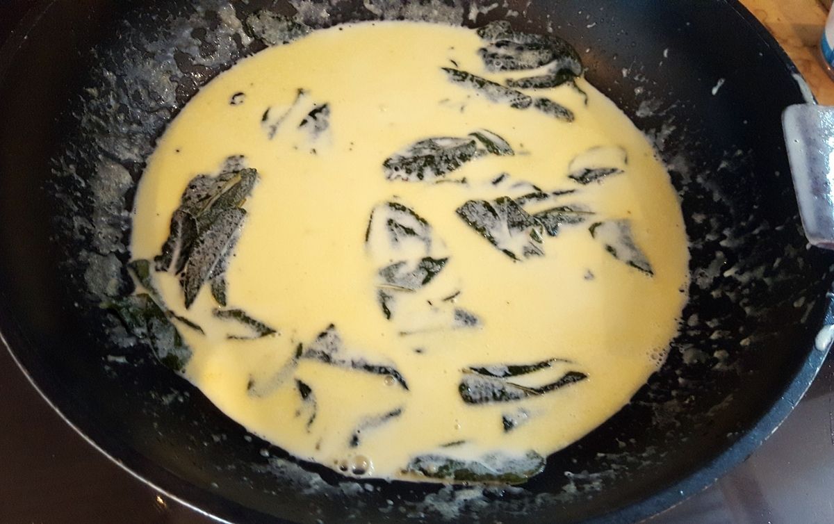 5) Parallèlement, préparer la crème de sauge (ou la sauce tomate, voir recette ICI): Dans une petite casserole, faire fondre le beurre puis ajouter les feuilles de sauge. Laisser cuire ainsi 2 minutes sur feu moyen en mélangeant puis ajouter la crème. Saler et poivrer. Porter à frémissements et laisser cuire 2 minutes.