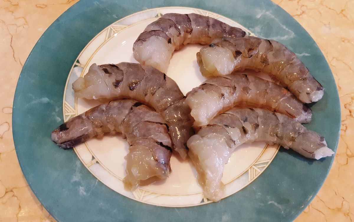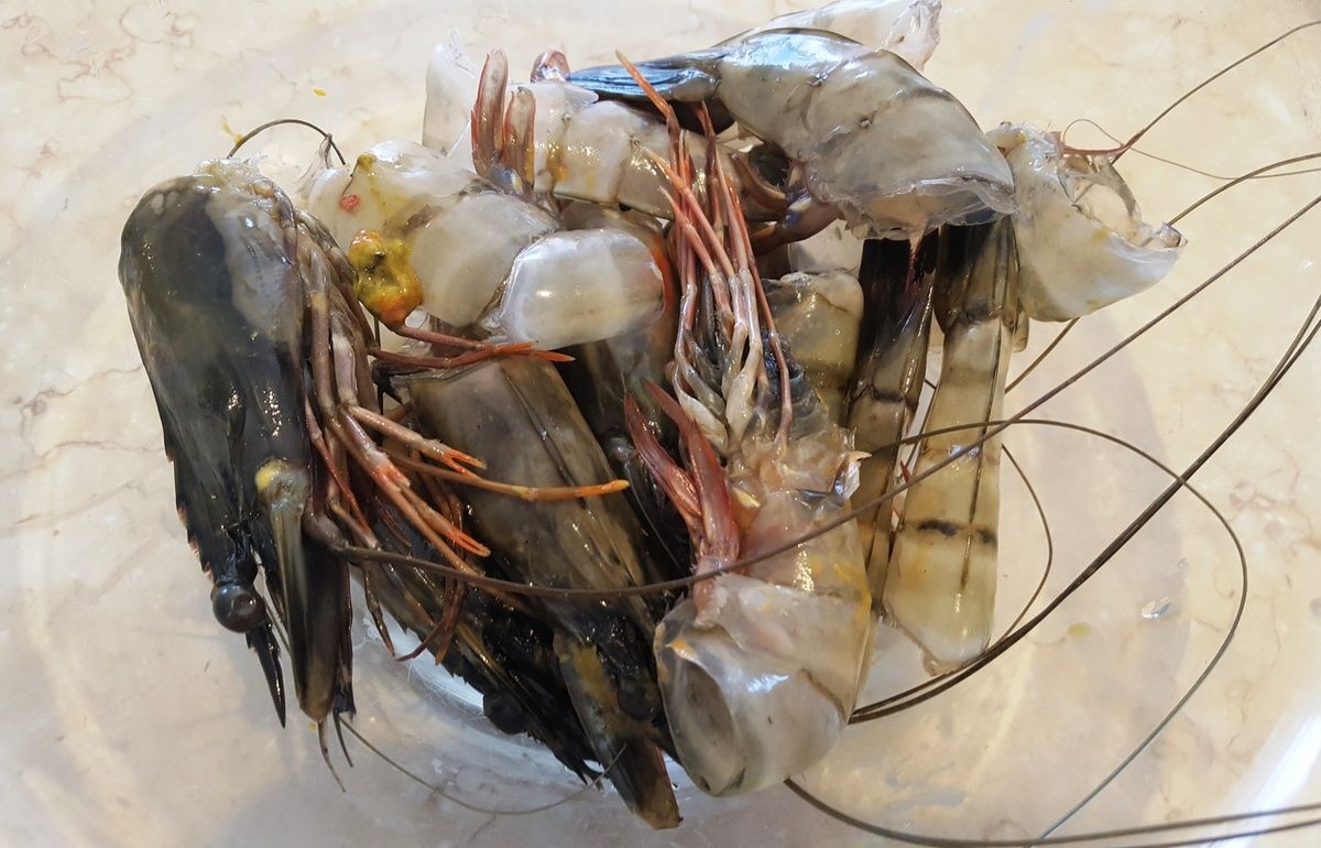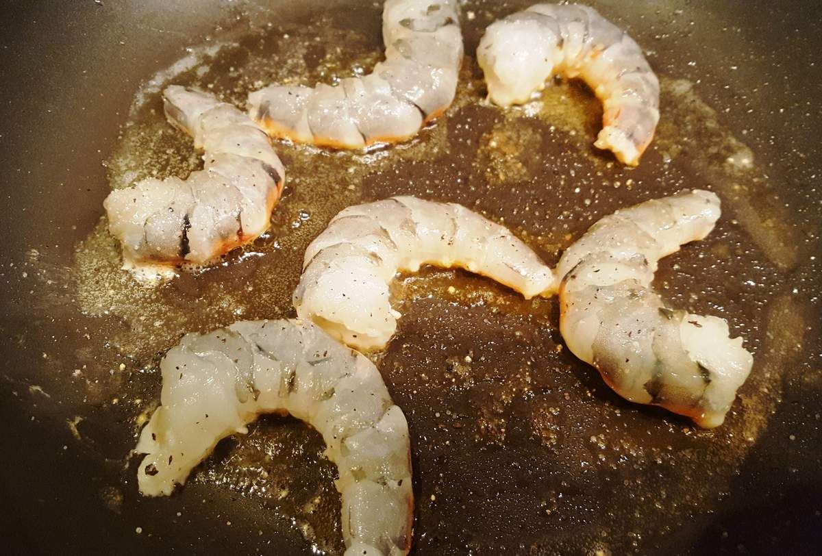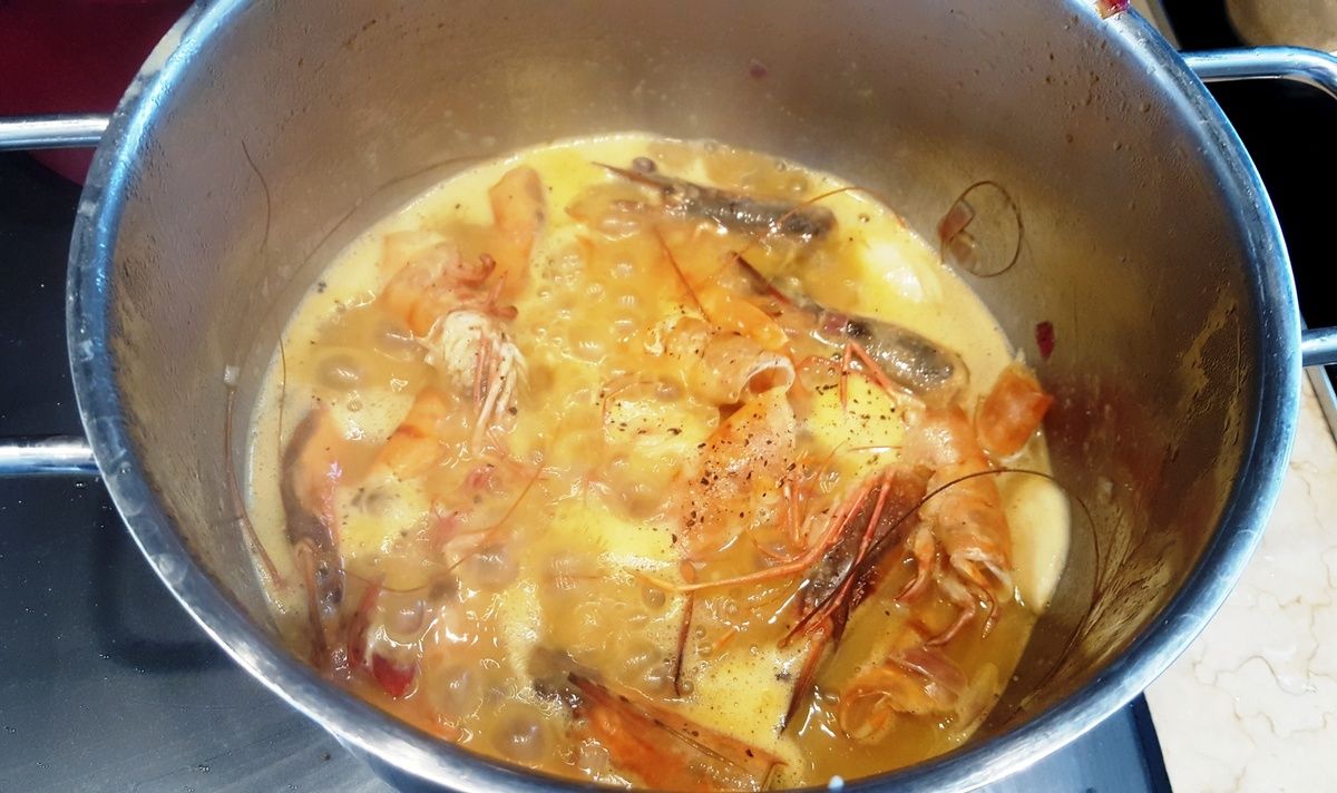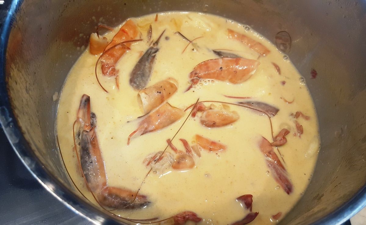 2) Sauce aux crevettes: décortiquer les crevettes et les réserver sur une assiette au réfrigérateur. Mettre les carapaces dans un récipient.
