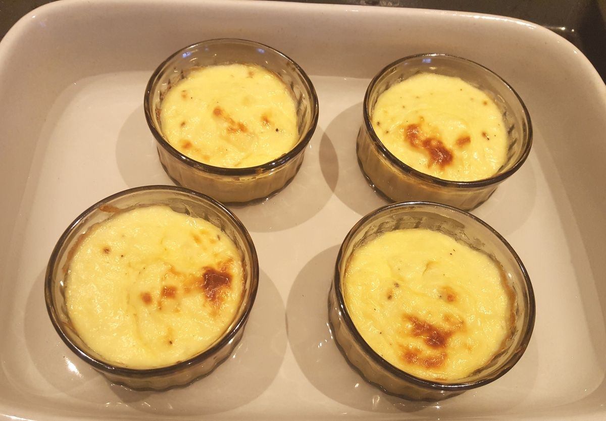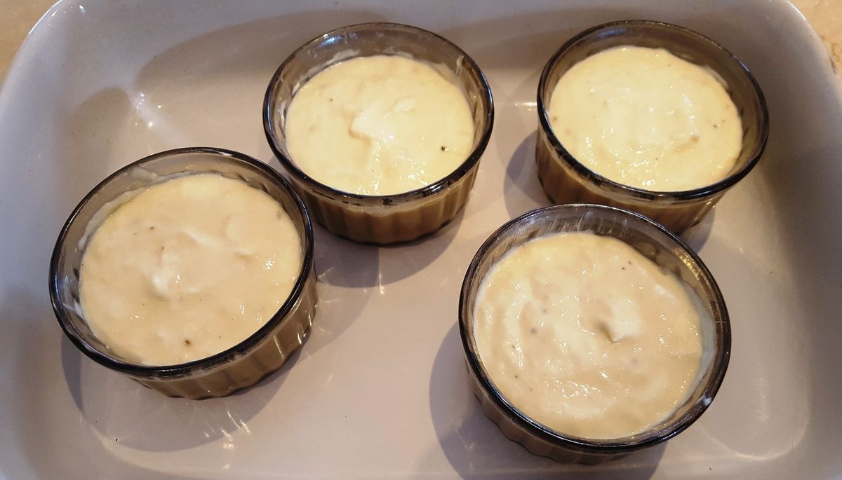 6) Verser l'eau bouillante jusqu'à mi-hauteur des moules et enfourner au milieu du four pour 25 à 30 minutes. Les mousselines doivent être un peu dorées en surface et levées.