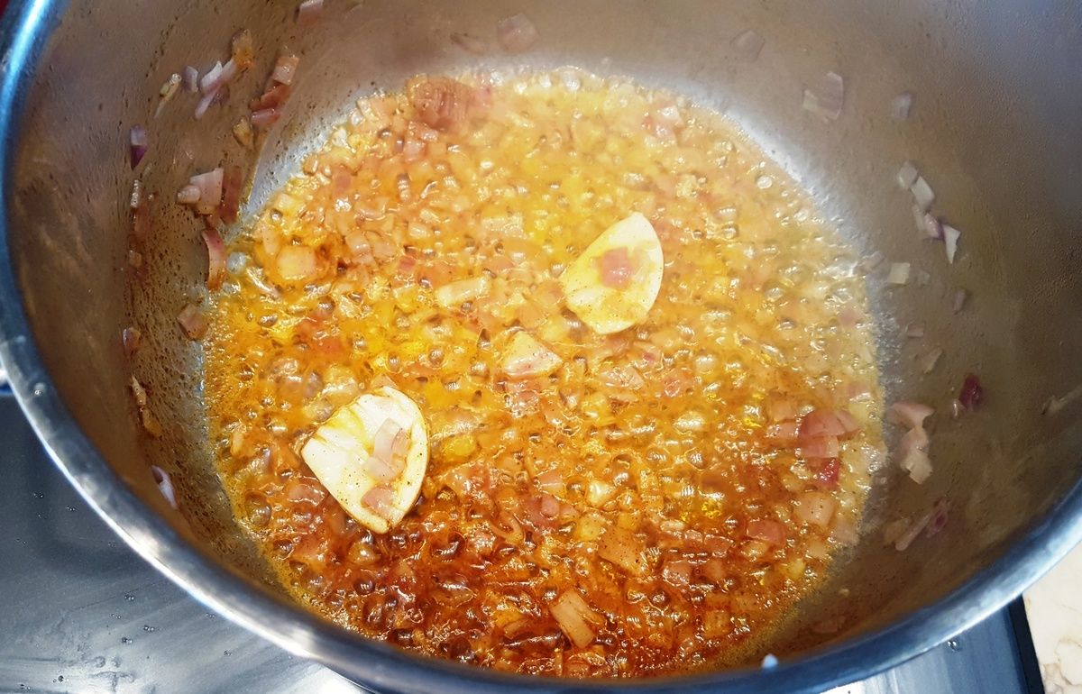 3) Hacher finement les échalotes. Ecraser la demie gousse d'ail pelée avec le plat d'un couteau. Dans une casserole, faire fondre un beau morceau de beurre puis faire revenir les échalotes 2 minutes en mélangeant. Ajouter ensuite la farine, le paprika et l'ail. Mélanger puis ajouter les 3dl d'eau chaude. Ajouter les carapaces des crevettes. Porter à ébullition en mélangeant. Ajouter ensuite la crème et à l'ébullition, baisser le feu sur feu doux et laisser mijoter à couvert une vingtaine de minutes.