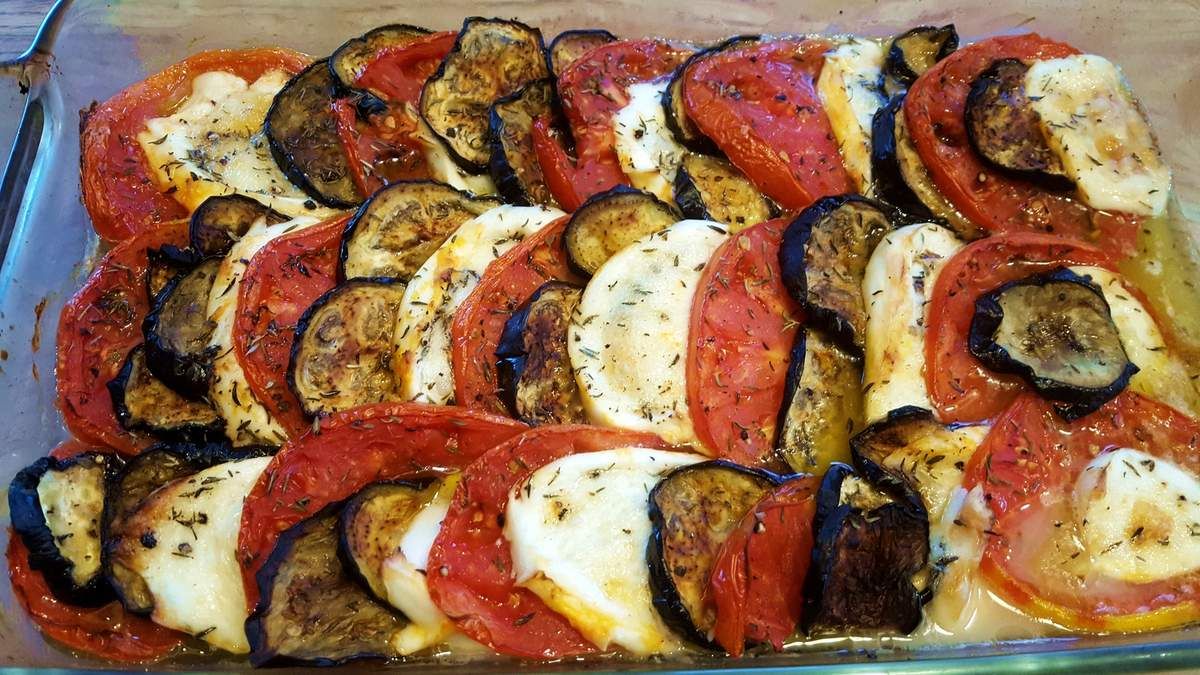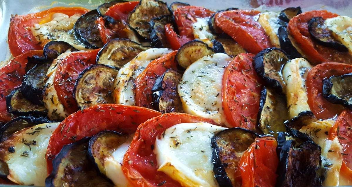 3) Dans un plat à gratin, mettre un filet d'huile d'olive dans le fond. Disposer les aubergines, la mozzarella et les tomates en alternance en les faisant se chevaucher. Saler, poivrer, saupoudrer de thym et romarin. Ajouter un petit filet d'huile d'olive et enfourner pour 20 minutes environ.