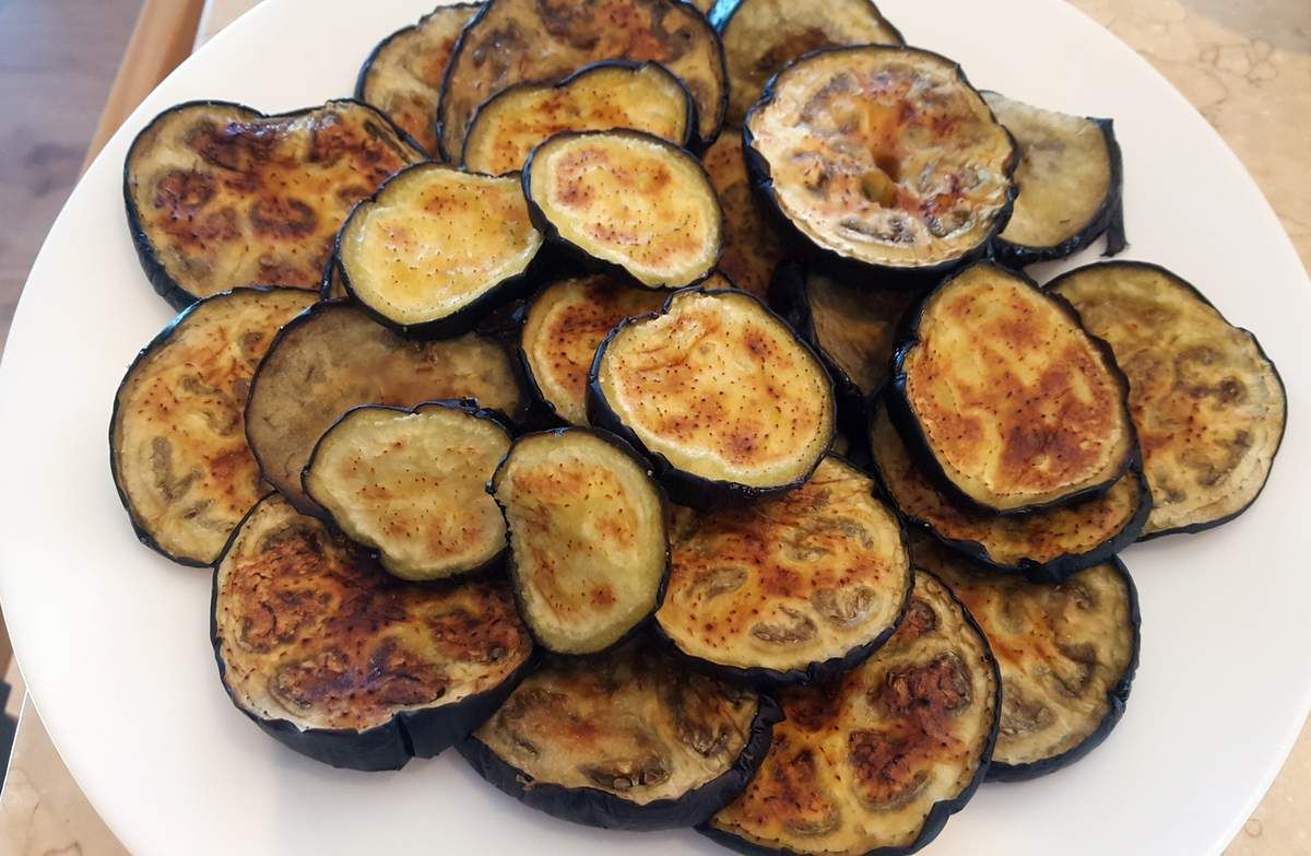 1) Préchauffer le four à 210°C avec fonction gril. Passer les aubergines sous l'eau froide, les essuyer, couper les extrémités. Les couper en rondelles d'1/2 cm d'épaisseur. Les disposer sur une feuille de papier sulfurisé sur une plaque. Avec un pinceau à pâtisserie, les badigeonner d'huile d'olive, saler et poivrer. Les mettre dans le haut du four 20 minutes en tout en les retournant au bout de 10 minutes. Elles doivent être cuites mais pas noires non plus. Les sortir et laisser le four à 210°C mais sans la fonction gril .