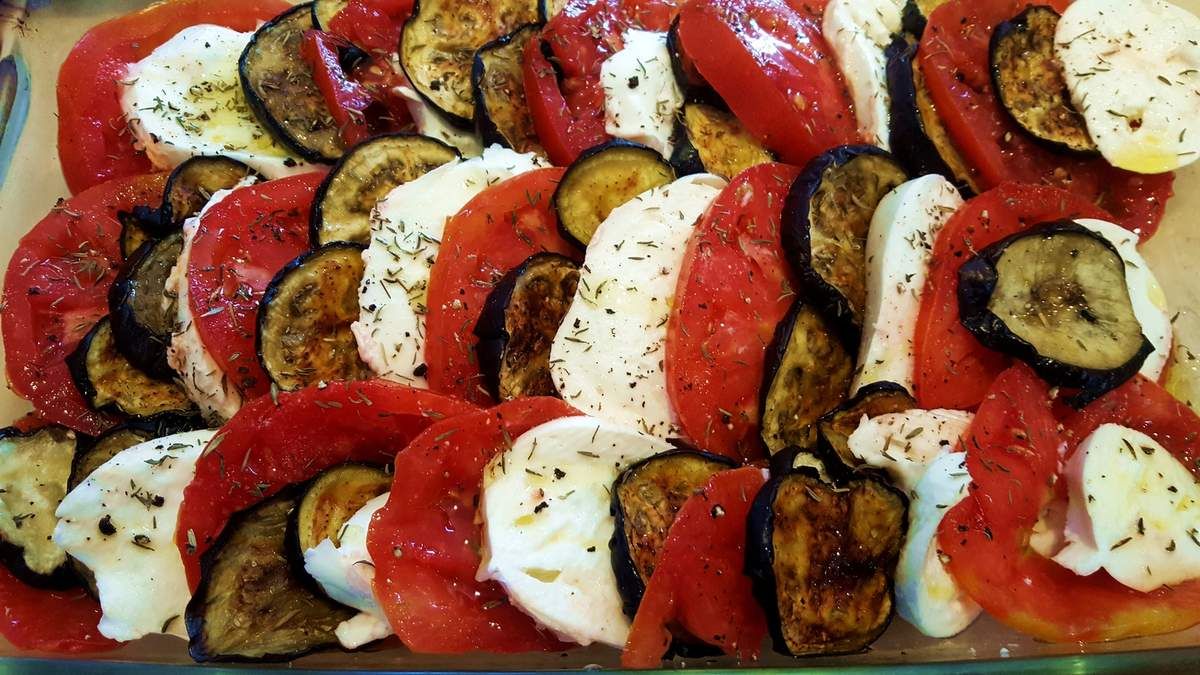 2) Laver les tomates, retirer le pédoncule et les couper en tranches de la même épaisseur que les aubergines. Egoutter les boules de mozzarella et les couper en tranches également.