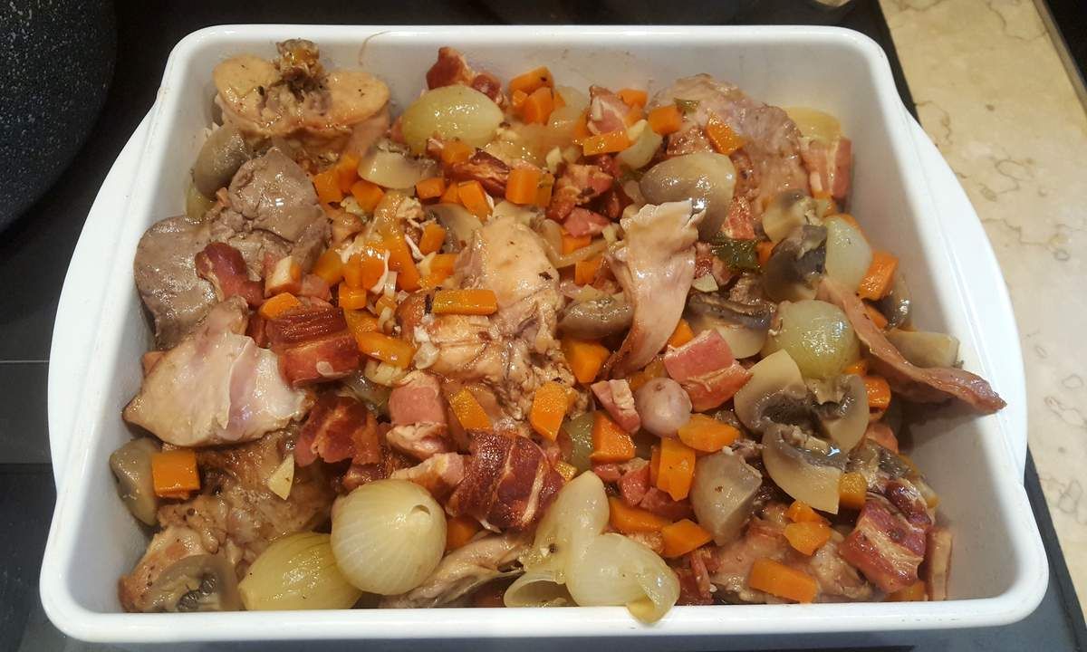 Dans cette recette, on cuisine le lapin coupé en morceaux avec TOUS les morceaux, plein de bons petits légumes, un bouquet garni. Et hop on le flambe avec de l'eau de vie de notre choix (moi je me suis servie dans le bar de mon homme et je lui ai "emprunté" un petit peu de cette excellente eau de vie de coing qui traînait par-là). Puis, on le laisse cuire à couvert avec du cidre ou du vin blanc. Au dernier moment, un peu de crème avec de la moutarde et le tour est joué. Mon homme s'est franchement régalé (il adore le lapin aussi, ouf).