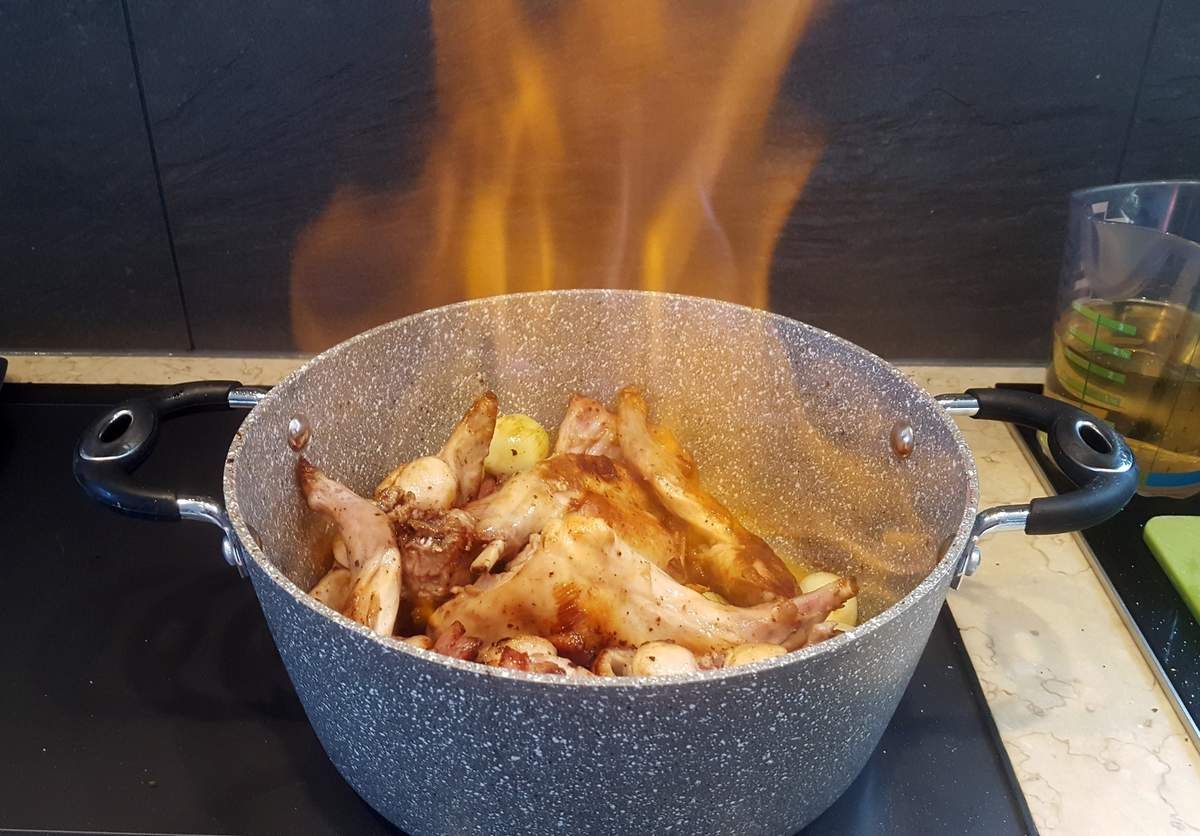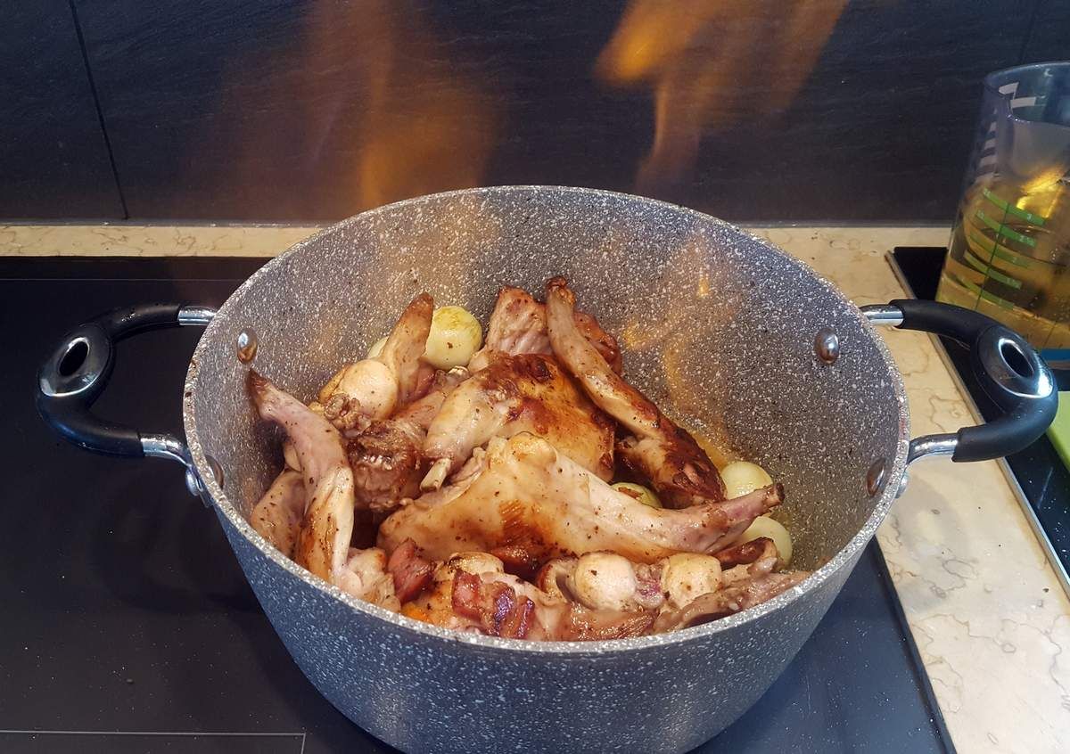 5) Remettre les morceaux de lapins dans la cocotte avec les lardons et les abats. Réchauffer en mélangeant. ETEINDRE LA VENTILATION (très important). Verser l'eau de vie dans la cocotte et immédiatement, à l'aide d'une grande allumette, flamber! Ne pas mélanger le contenu jusqu'à ce qu'il n'y ait plus de flamme. Pour flamber à coup sûr, chauffer un peu l'alcool avant (mais là je ne l'ai pas fait et ça a flambé du tonnerre).