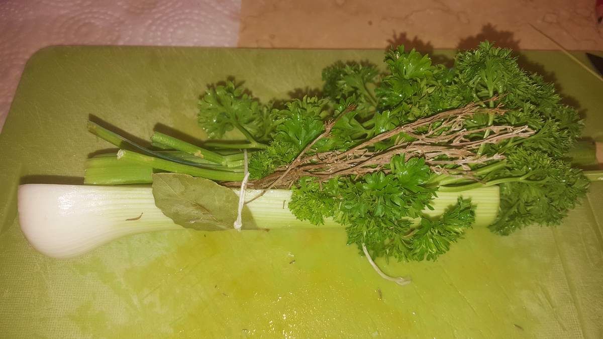 1) Préparer le bouquet garni: passer le demi-poireau sous l'eau froide, rincer la branche de céleri et les branches de persil. Avec une ficelle de cuisine, réunir le poireau, le céleri, la feuille de laurier, le thym et les branches de persil.