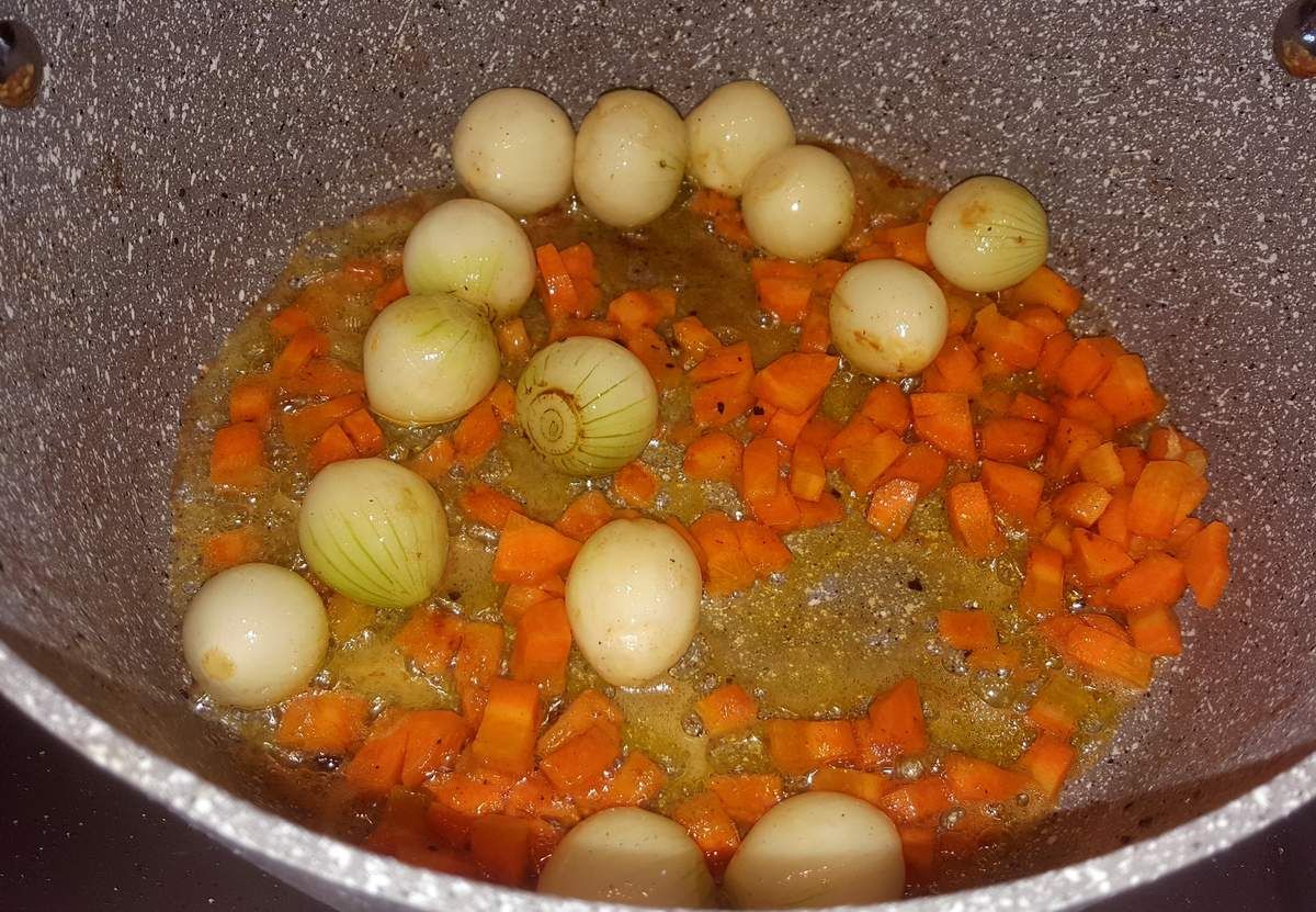 4) Dans la même cocotte, remettre un peu d'huile à rôtir et faire revenir les carottes et les oignons grelots quelques minutes. Saupoudrer avec le sucre, mélanger encore un peu.