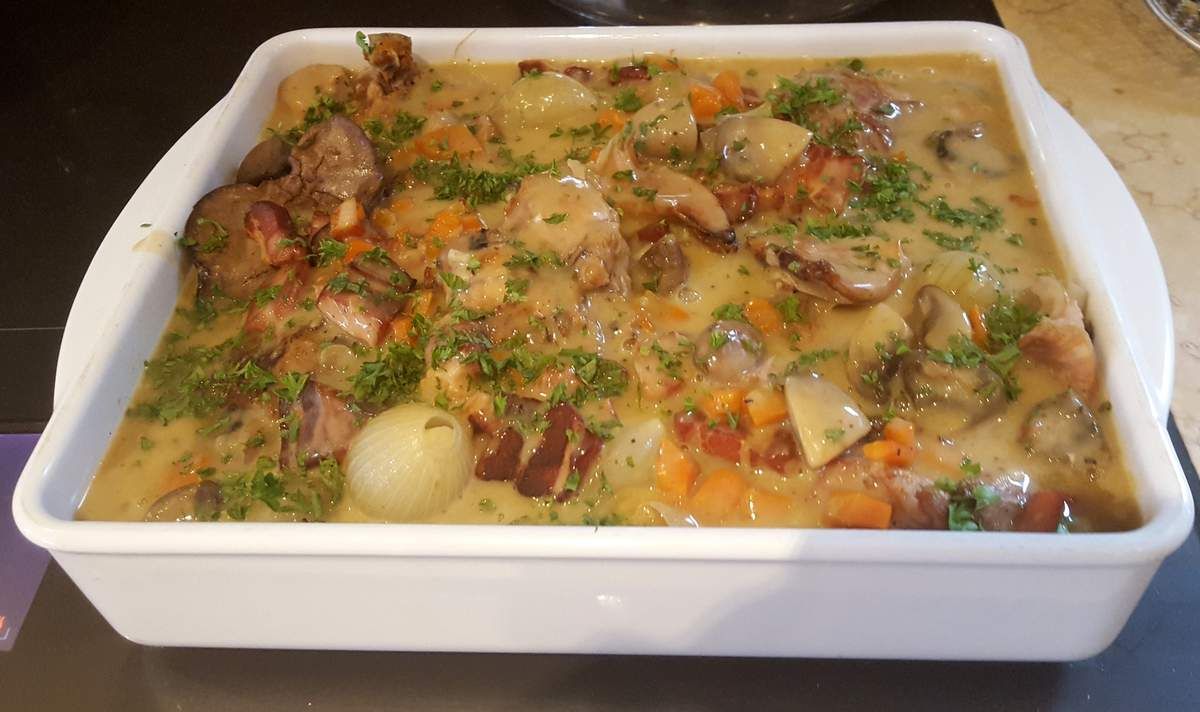 Moi j'aime beaucoup le lapin. Ce doit être dans mes gènes. Mon grand-papa adorait cuisiner le lapin. Et ma maman aussi. Avec la tête, les abats et tout et tout. Miam. En gibelotte? C'est un terme qu'on utilisait et qu'on utilise encore pour dire "en fricassée".