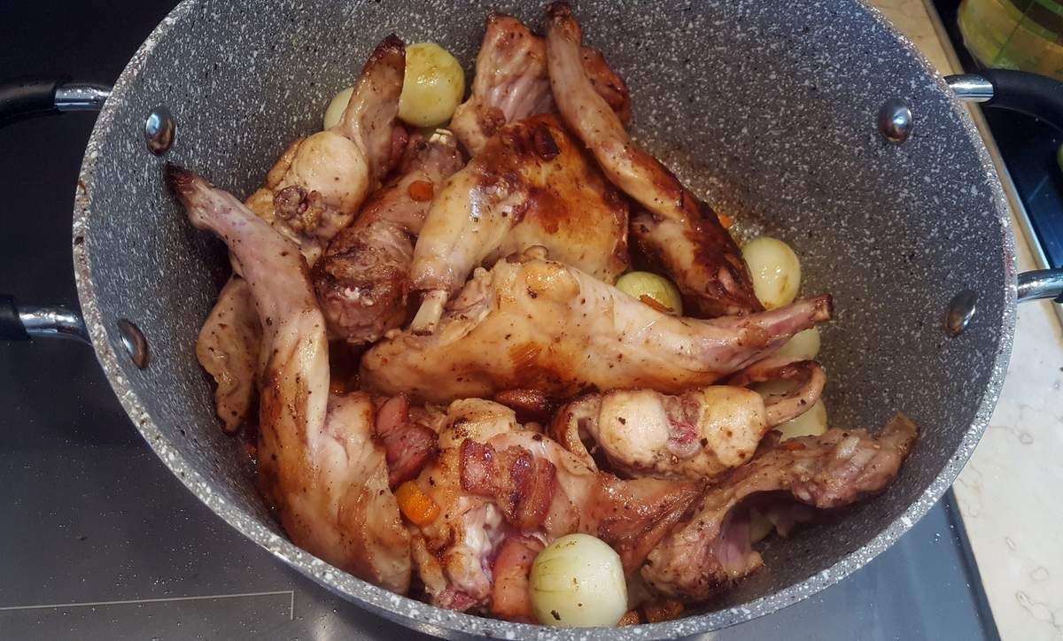 3) Saler et poivrer les morceaux de lapin de toutes parts. Dans une cocotte, faire revenir les morceaux de lapin (sauf les abats) dans de l'huile à rôtir jusqu'à ce qu'ils soient bien dorés. Procéder en plusieurs fois si nécessaire. Réserver les morceaux dans un plat. Faire revenir les lardons quelques minutes et réserver avec les morceaux de lapin et les abats. Essuyez la cocotte avec du papier ménage.