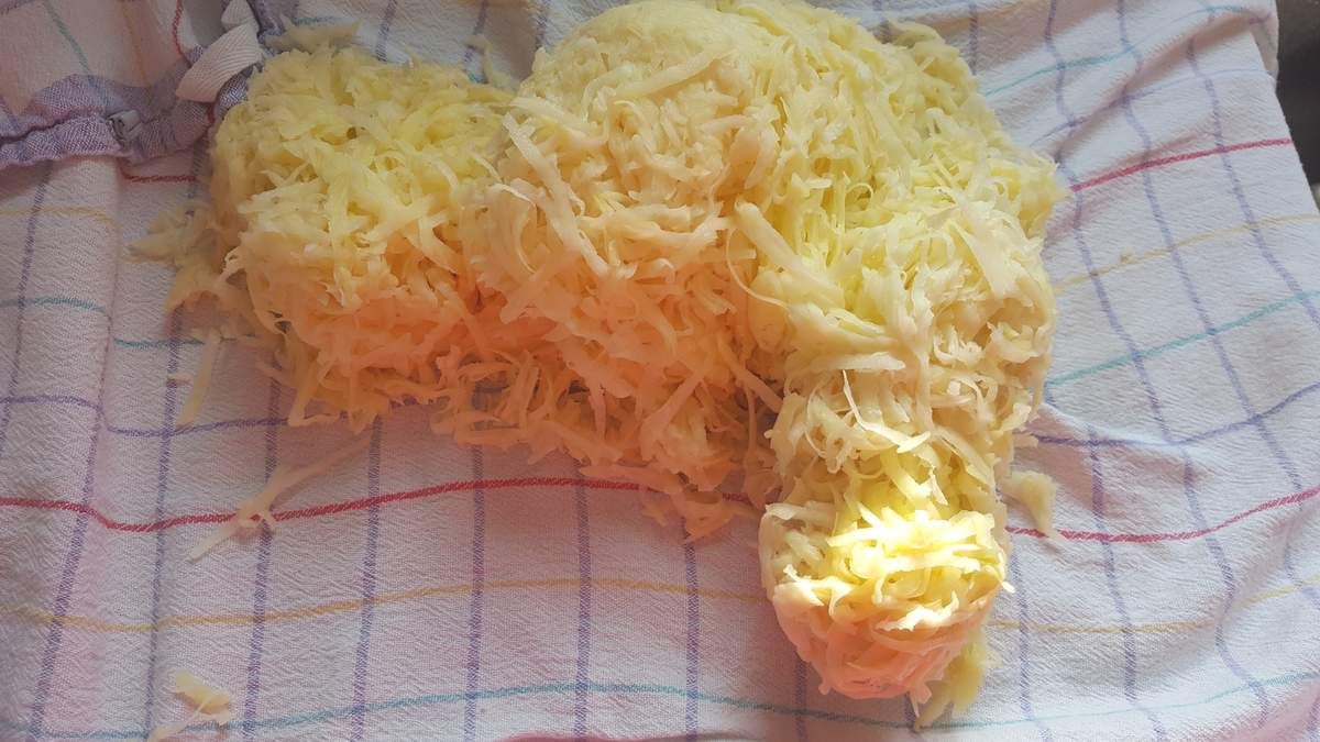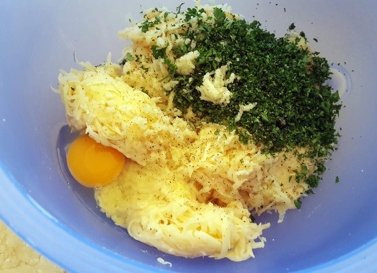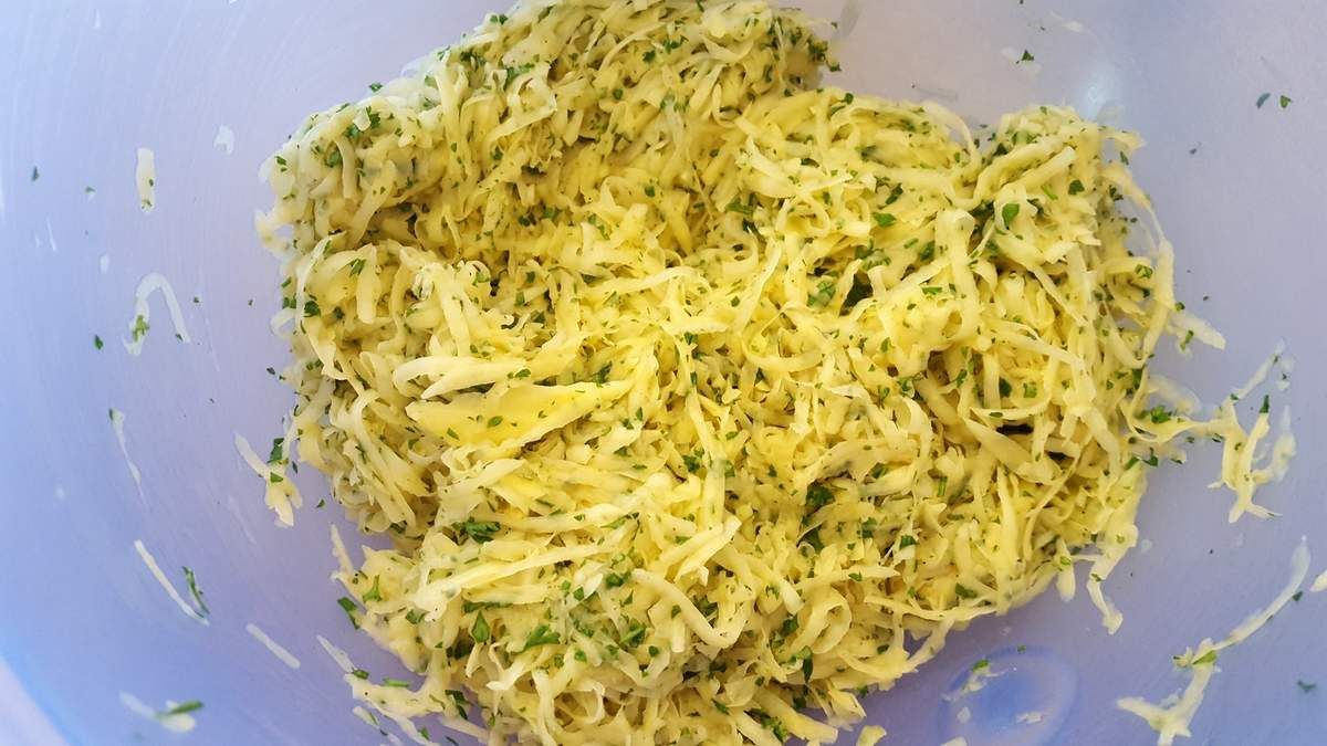1) Hacher le persil. Peler les pommes de terre et les passer sous l'eau froide. Les sécher avec un linge. Les passer à la râpe à gros trous, style râpe à röstis (attention à vos petits doigts). Mettre les pommes de terre râpées dans un linge propre. Au-dessus de l'évier, fermer le linge en baluchon et le tordre aux extrémités en tournant, comme pour le papier d'un bonbon, plusieurs fois fortement, pour éliminer le maximum de jus des pommes de terre. Mettre dans un récipient.