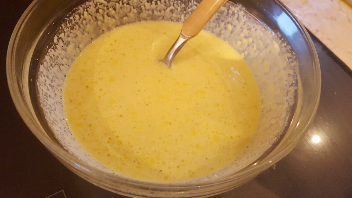 2) Pendant ce temps, dans un grand bol, casser les oeufs et les mélanger avec une fourchette. Ajouter la crème, le parmesan, l'huile de truffe, saler et poivrer généreusement.