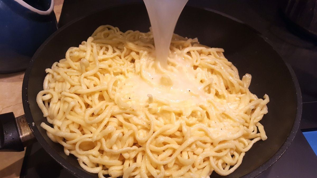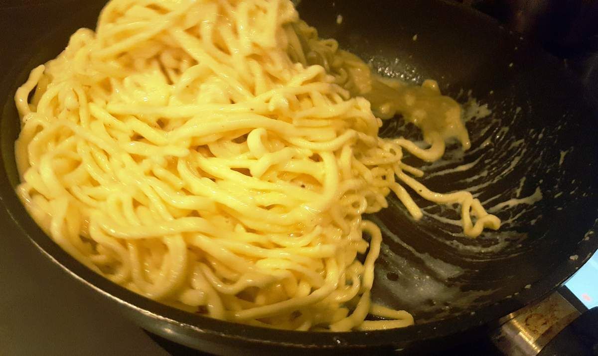 3) Juste avant la fin de la cuisson des pâtes, prélever 2 à 3 louches de jus de cuisson et réserver. Egoutter les pâtes. Dans une poêle, verser les pâtes. Sur feu moyen, ajouter le mélange aux oeufs tout en mélangeant une minute. Ajouter ensuite 2 à 3 louches d'eau de cuisson des pâtes et mélanger encore une minute sur feu doux, pour éviter que les oeufs ne cuisent trop. Servir immédiatement dans des assiettes creuses.