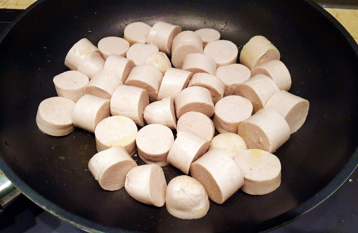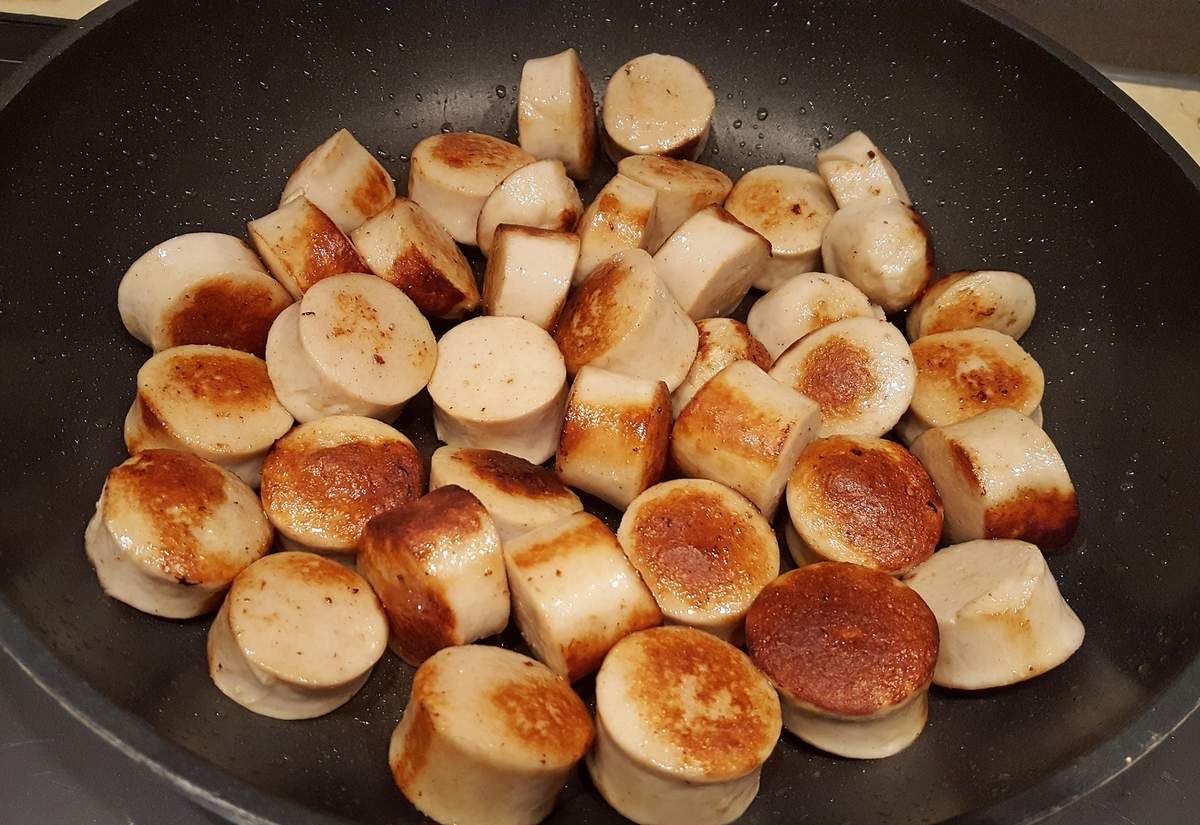 3) Pendant ce temps, peler les saucisses et les couper en tronçons assez gros (2 à 3 cm de largeur environ). Faire revenir les saucisses dans une poêle avec un peu d'huile d'olive quelques minutes en mélangeant jusqu'à ce qu'elles soient dorées. Baisser le feu au minimum pour les tenir au chaud.