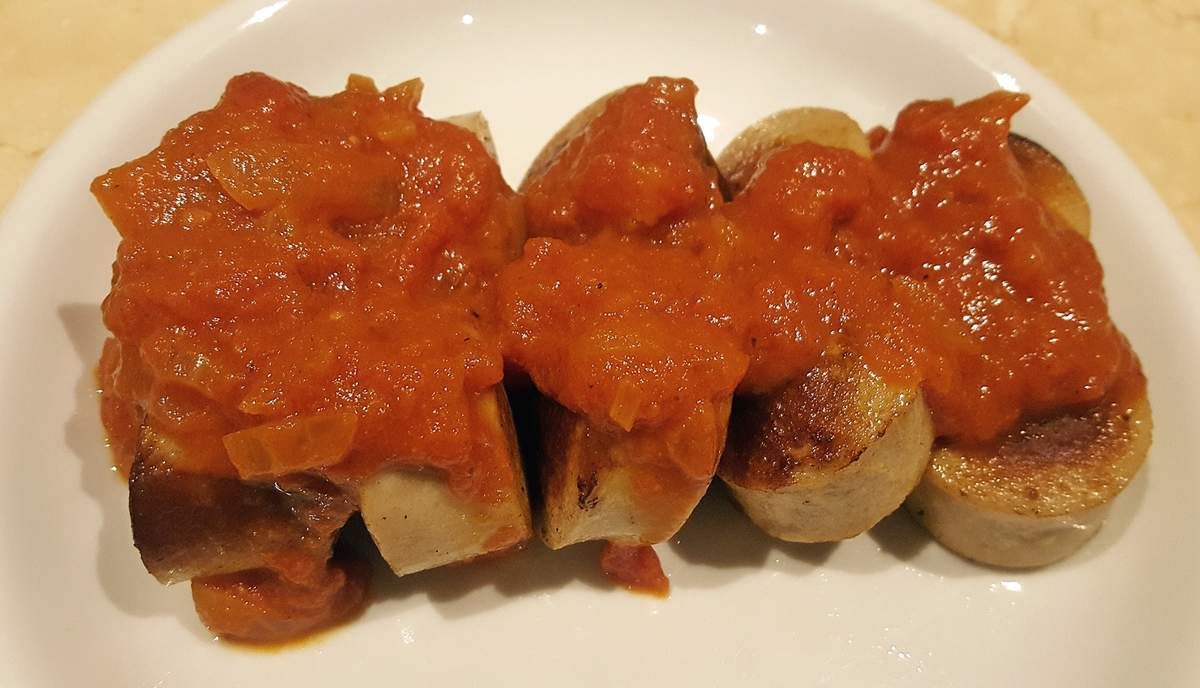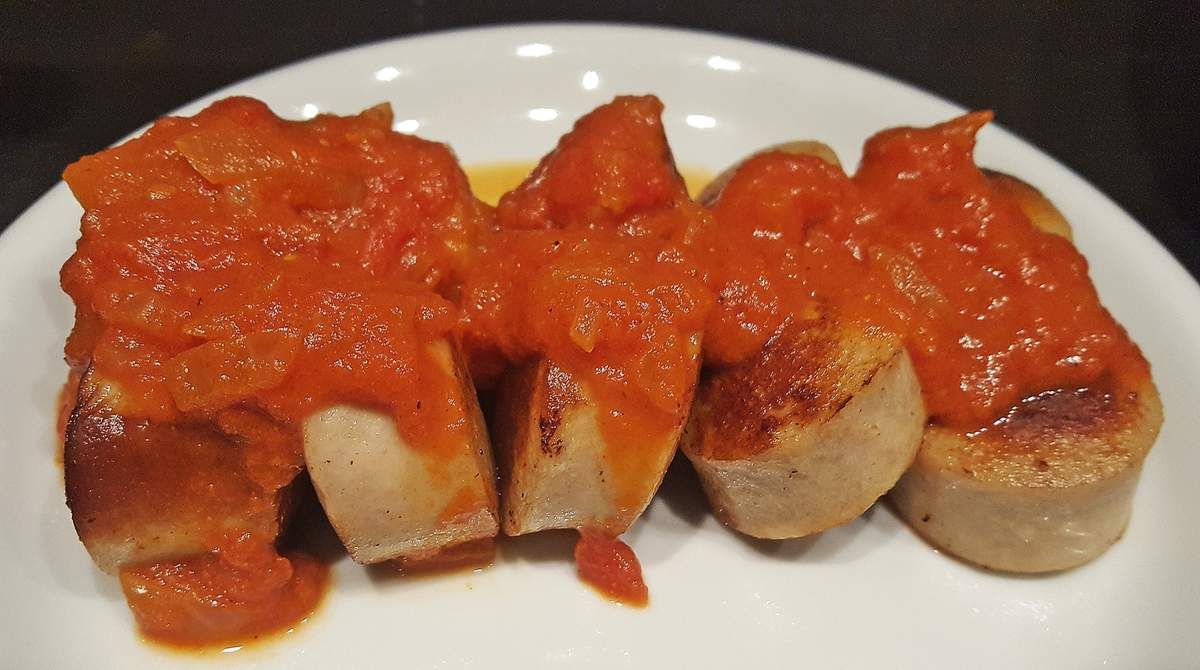 De la saucisse de veau pour ma part (mais prenez une vraie "Bratwurst" si vous voulez vraiment vous la jouer typique), nappée d'un délicieux condiment fait de tomates, curry, vinaigre, moutarde, sucre et ketchup. J'ai beaucoup aimé, oui oui. Et non, cela n'est pas doucereux. C'est top. Et cela va vous donner une nouvelle idée pour cuisiner la petite saucisse qui pleure d'ennui dans votre réfrigérateur. Soyez sympas, ne la laissez pas dans cet état.