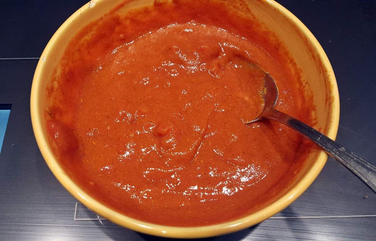 2) Dans un bol, mélanger soigneusement le reste des tomates, soit 100g, le curry, le vinaigre, la moutarde, le ketchup, le sucre et une bonne pincée de sel. Ajouter dans la casserole des tomates et mélanger. Poivrer. Laisser mijoter 15 minutes.