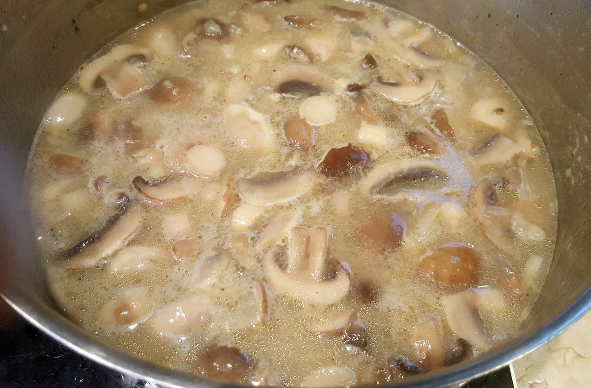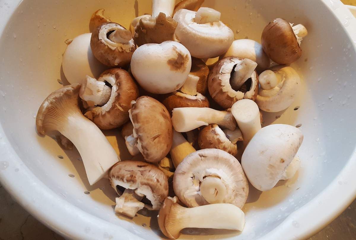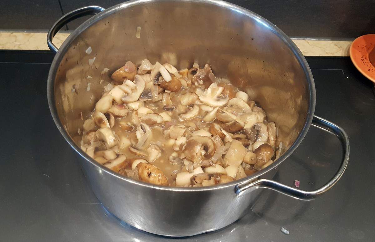 1) Couper la base des pieds des champignons, les laver sous l'eau froide et les éponger avec du papier absorbant. Les couper grossièrement (les champignons de Paris en 2 ou 3 par exemple). Conserver deux ou trois champignons entiers pour pouvoir les couper en lamelles comme déco au service. Réserver.