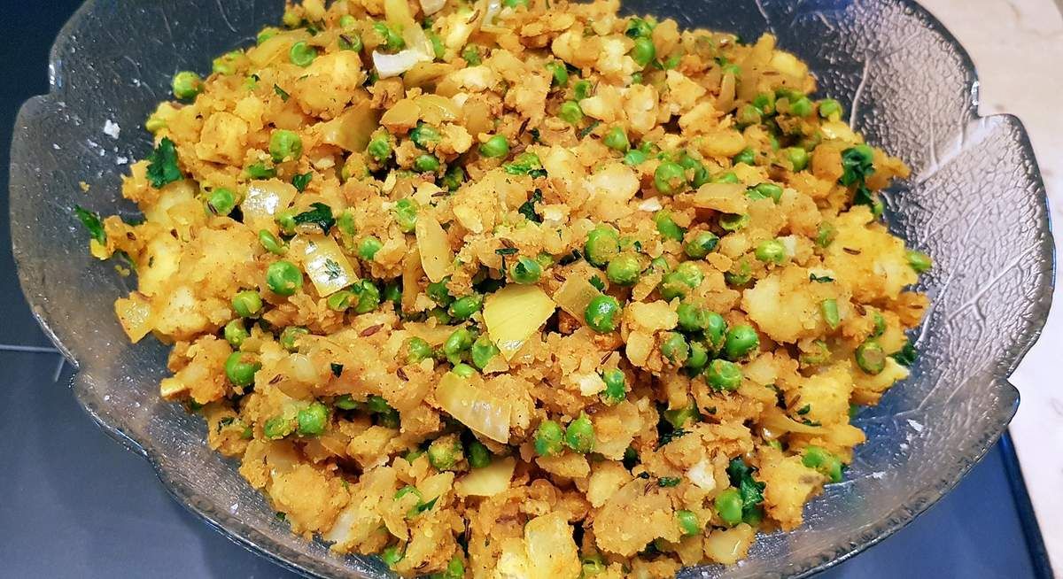 4) Dans une poêle, mettre un peu d'huile d'olive et faire revenir les graines de cumin, les oignons, l’ail et le gingembre quelques minutes sur feu moyen en mélangeant. Ajouter le curry, le curcuma et les petits pois. Mélanger puis ajouter les pommes de terre écrasées et la coriandre ciselée. Saler et bien mélanger. Goûter et rectifier l’assaisonnement. Sortir du feu et laisser tiédir.