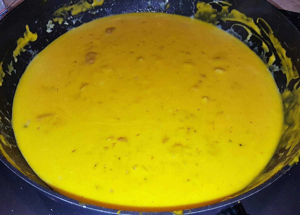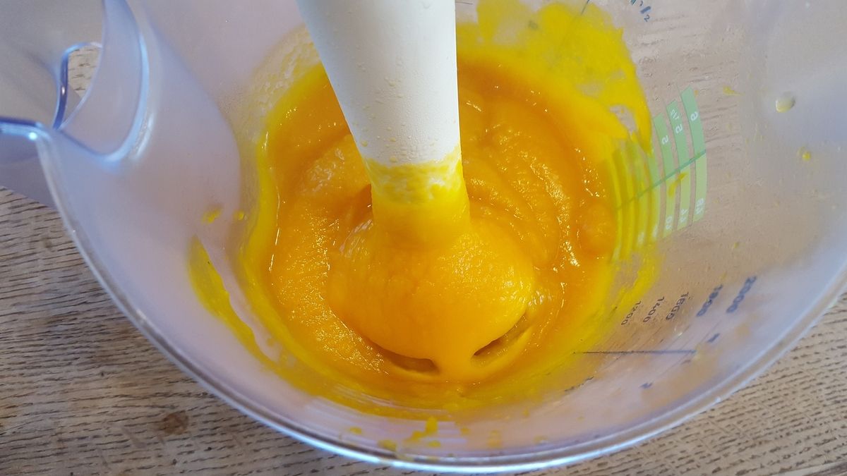2) Mettre les morceaux de courge dans le récipient haut contenant l'eau de cuisson réservé et mixer avec un plongeur jusqu'à l'obtention d'une purée bien lisse. Réserver.