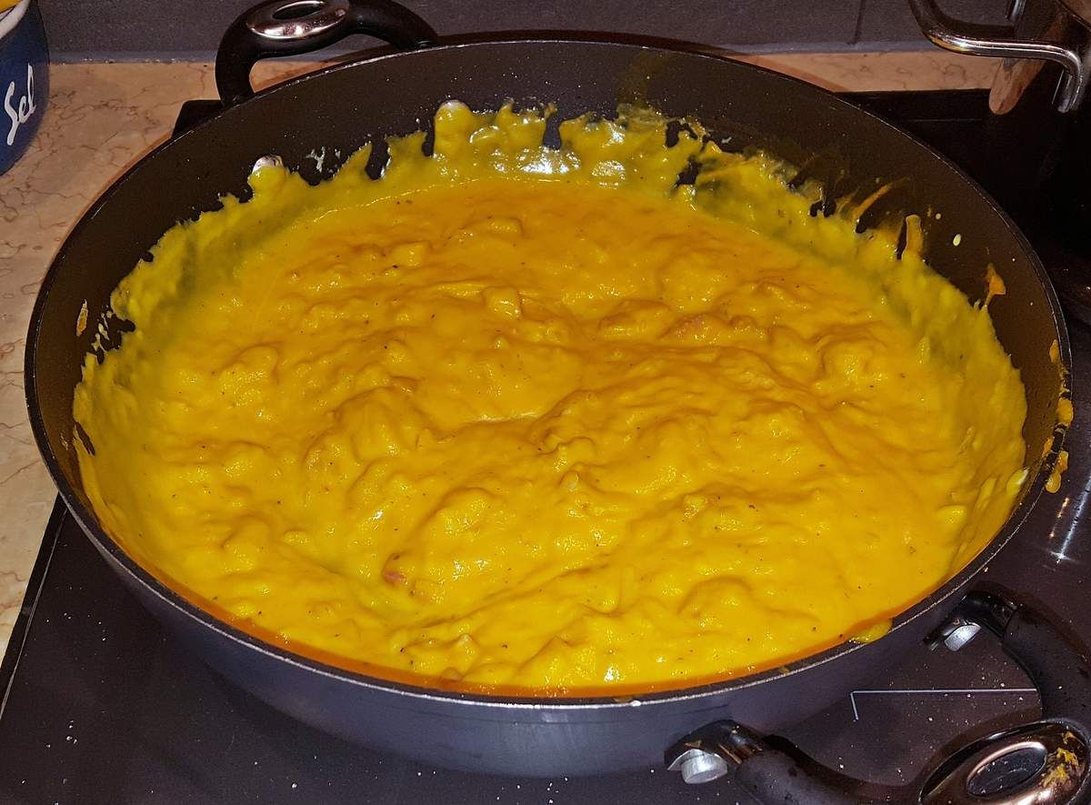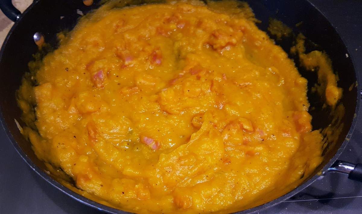 4) Dans la même grande poêle haute, faire revenir l'oignon et le lard sur feu moyen-vif dans l'huile qui aura servi à frire la sauge, en mélangeant durant 5 minutes. Ajouter la purée de courge. Poivrer un peu et laisser mijoter 5 minutes sur feu doux. Parallèlement, démarrer la cuisson des pâtes.