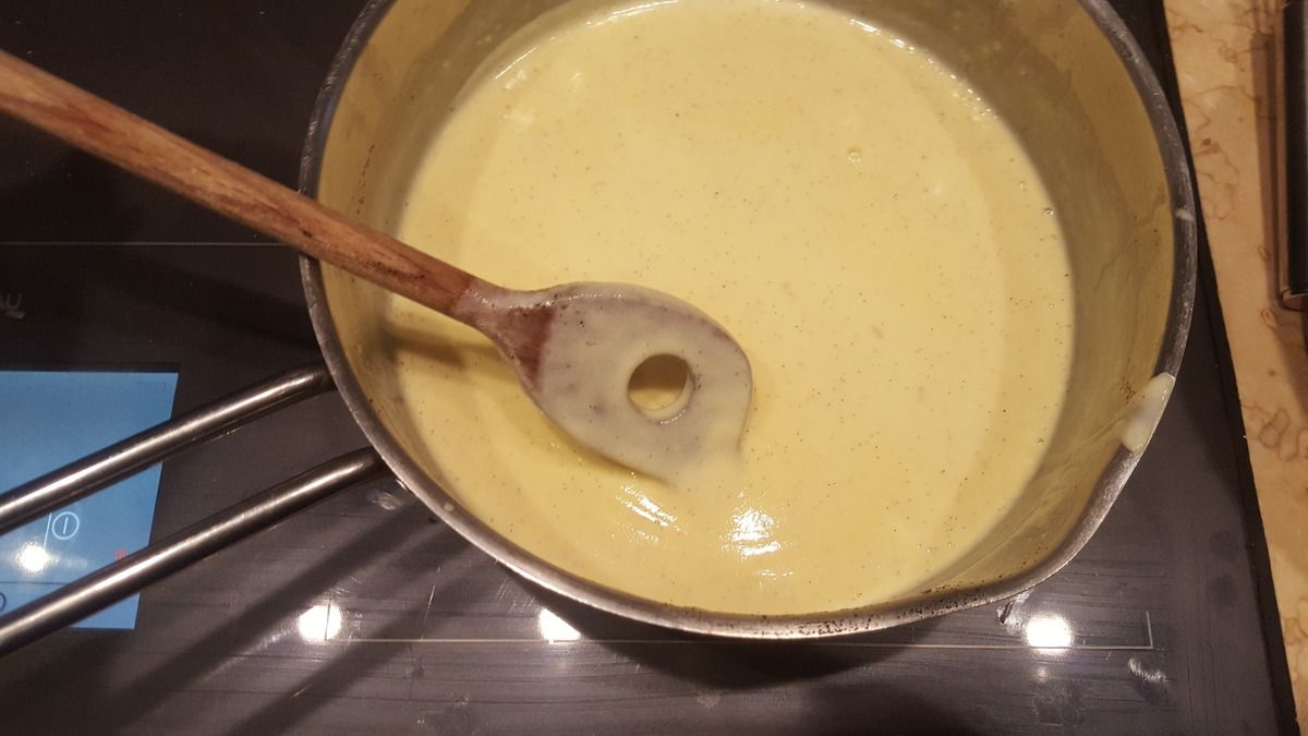 Remettre la crème dans la casserole et sur feu moyen, amener à petite ébullition en mélangeant avec une spatule en bois. Baisser le feu. Toujours bien mélanger. Ne pas laisser bouillir car les oeufs risquent de coaguler. Lorsque la crème est nappante (le test: lorsque vous trempez la spatule dans la crème et que vous passez le doigt dessus, elle doit laisser un sillon), la sortir du feu et laisser tiédir ou refroidir.
