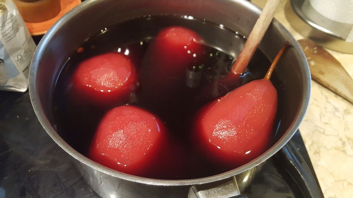 1) Peler les poires en les laissant entières avec leurs queues. Dans une casserole, mettre le vin rouge, le sucre, la badiane, la cannelle et les clous de girofle. Ajouter les poires. Ajouter de l’eau si nécessaire afin qu’elles soient immergées. Porter à ébullition. A l’ébullition, baisser le feu et laisser cuire à frémissements environ 30 minutes. Vérifier la cuisson des poires en plantant la lame d’un petit couteau. Elles doivent être bien tendres à coeur. Sortir la casserole du feu, couvrir et laisser les poires dans leur jus.