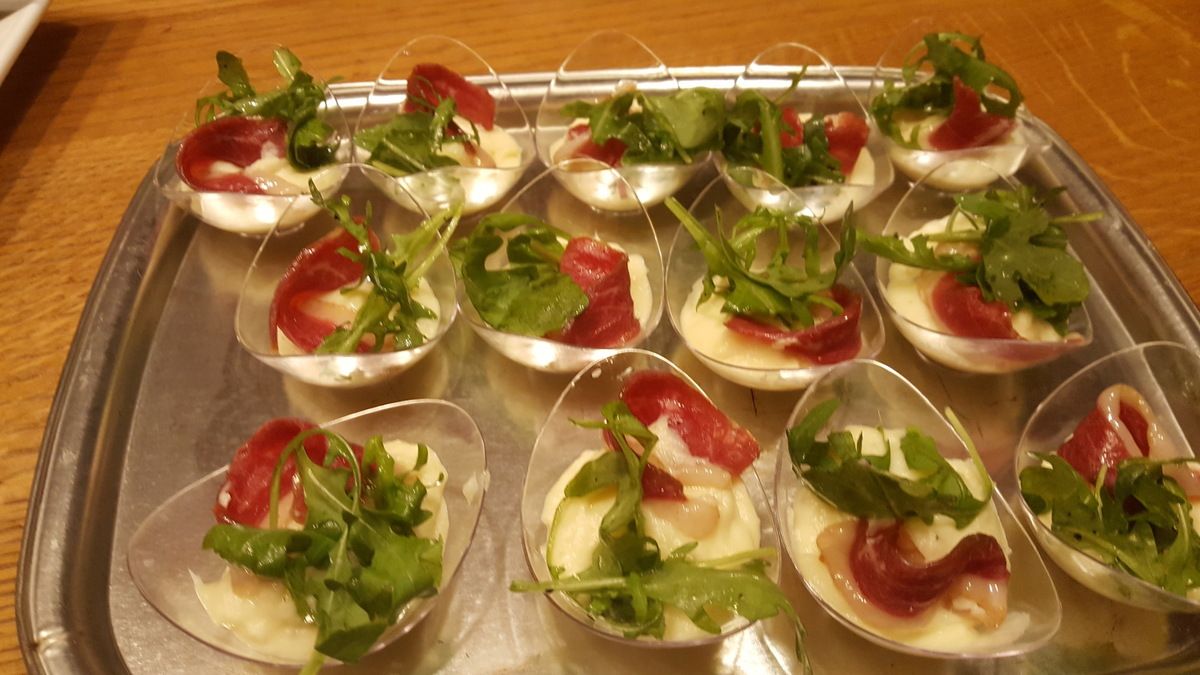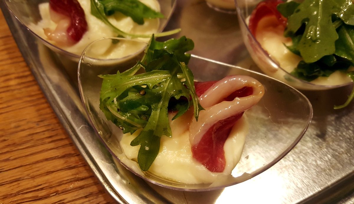 Verrines de purée de panais, magrets de canard fumés et roquette