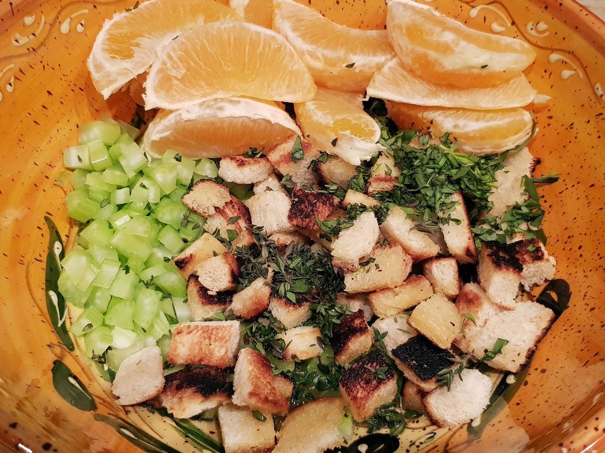 Mettre tous ces ingrédients dans un plat: Laver les branches de céleri et les couper en petits dés (sans les feuilles). Peler et hacher la gousse d'ail. Hacher l'estragon et le thym et en mettre la moitié dans le plat (réserver l'autre moitié à part). Peler une orange et en retirer les quartiers, mettre dans le plat. Verser le beurre fondu dans le plat, saler et poivrer et ajouter le cumin ainsi que le pain de mie en morceaux. Ajouter 2 càs du bouillon de volaille (garder le reste pour la sauce). Bien bien mélanger le tout!
