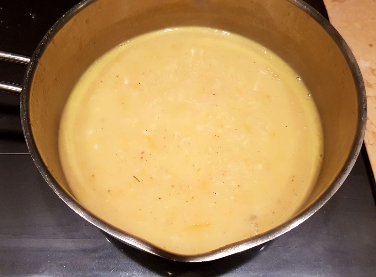 4) Pendant ce temps, préparer la sauce: Râper le zeste de la deuxième orange et en extraire le jus. Délayer la fécule dans le lait de coco. Peler le gingembre et le râper finement. Remettre à chauffer le bouillon restant du point 2. Y ajouter le vinaigre, le lait de coco avec la fécule, le zeste d'orange, le jus de l'orange, le gingembre, le sucre brun. Saler et poivrer. Porter à frémissements et mélanger jusqu'à épaississement de la sauce. Arroser les poulets à mi-cuisson avec deux petites louches de cette sauce.