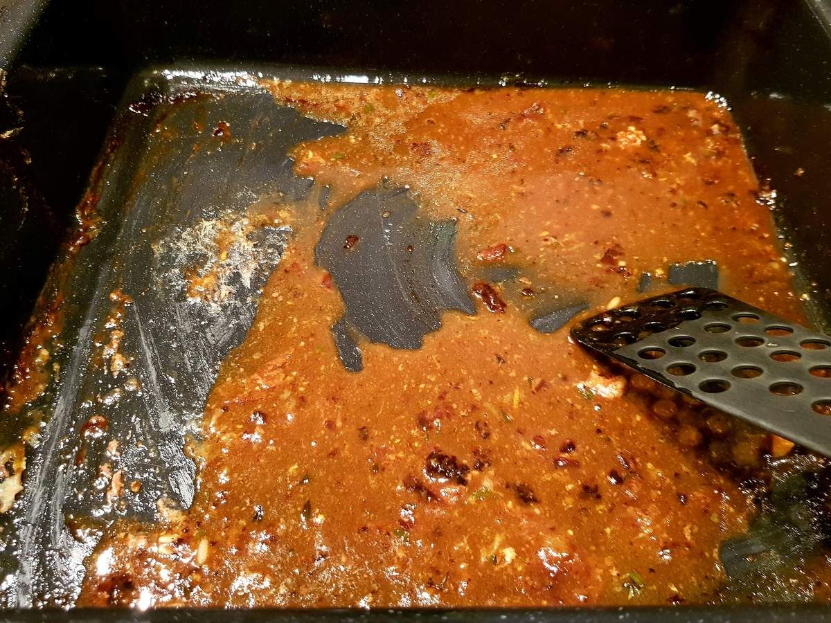5) Lorsque les poulets sont cuits, les sortir du four et les mettre sur un plat pour les laisser reposer 5 minutes. Gratter le fond de la lèchefrite avec une spatule et ôter le gras en penchant doucement la lèchefrite au-dessus de l'évier. Le gras va s'écouler en premier. Ou à l'aide d'une cuillère. Mettre le jus dans la sauce et mélanger.