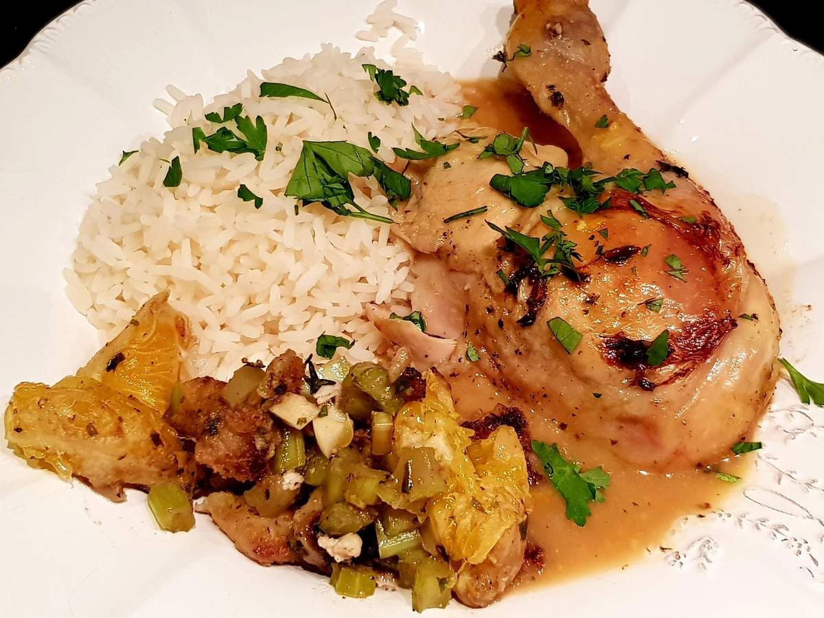 J'ai adoré ce poulet rôti avec une sauce à l'orange et au gingembre et farci d'un mélange de pain de mie, herbes, quartiers d'orange, ail, céleri branche et cumin. Franchement c'était original, équilibré au niveau des goûts et subtil. A refaire sans hésitation!