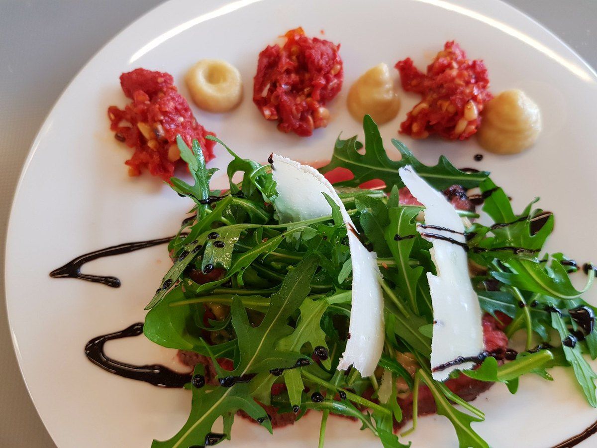 Imaginez... un filet de boeuf cuit en basse température, tendre à souhait, nappé d'une salsa verde à l'italienne aux herbes fraîches, câpres, ail, anchois et huile d'olive, une petite poignée de rucola qui apporte du peps, quelques copeaux d'un bon parmesan, des quenelles de tomates confites et pignons, un soupçon de purée d'artichauts parfumée à la truffe, le tout agrémenté d'un filet de vinaigre balsamique sirupeux.