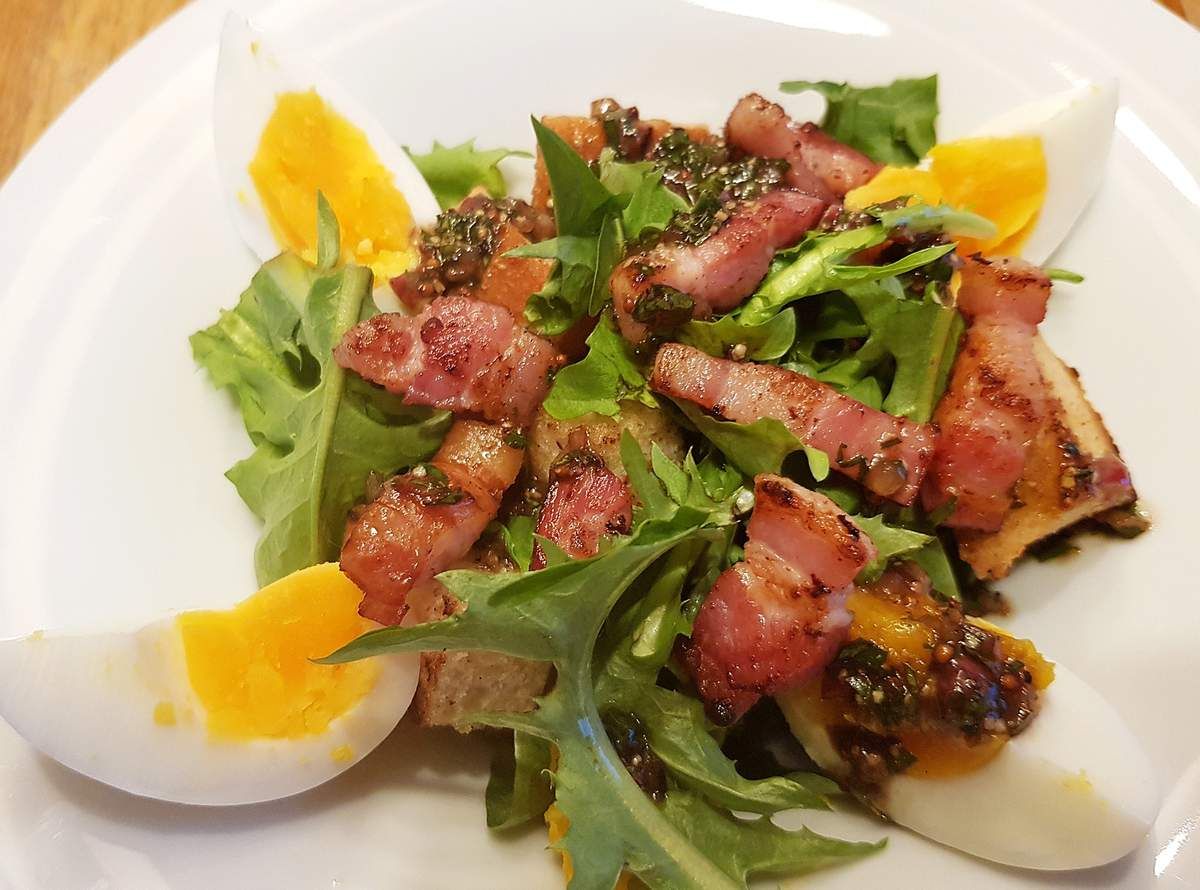 7) Dressage: réchauffer éventuellement un peu les lardons dans une poêle. Mettre une poignée de dent-de-lion dans une assiette creuse. Ajouter quelques lardons et croûtons. Disposer les oeufs joliment. Arroser avec un peu de vinaigrette (ne pas mélanger la vinaigrette avec la salade à l'avance). Déguster!