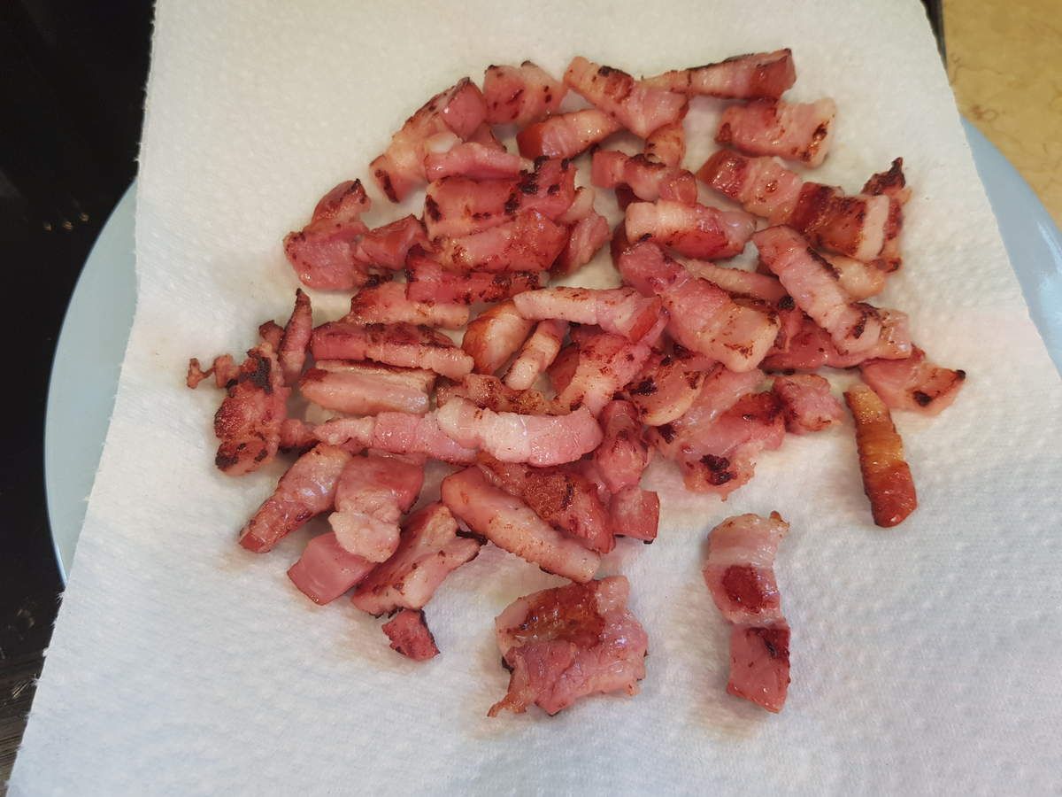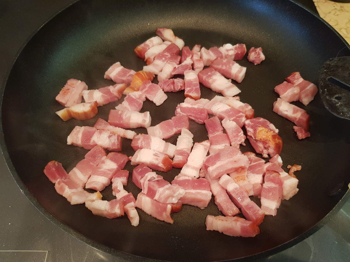 3) Enlever la couenne du lard puis couper en tranches pour obtenir des lardons. Dans une poêle sans matière grasse, faire revenir les lardons quelques minutes sur feu vif en mélangeant jusqu'à ce qu'ils soient dorés. Les égoutter sur du papier ménage et réserver.