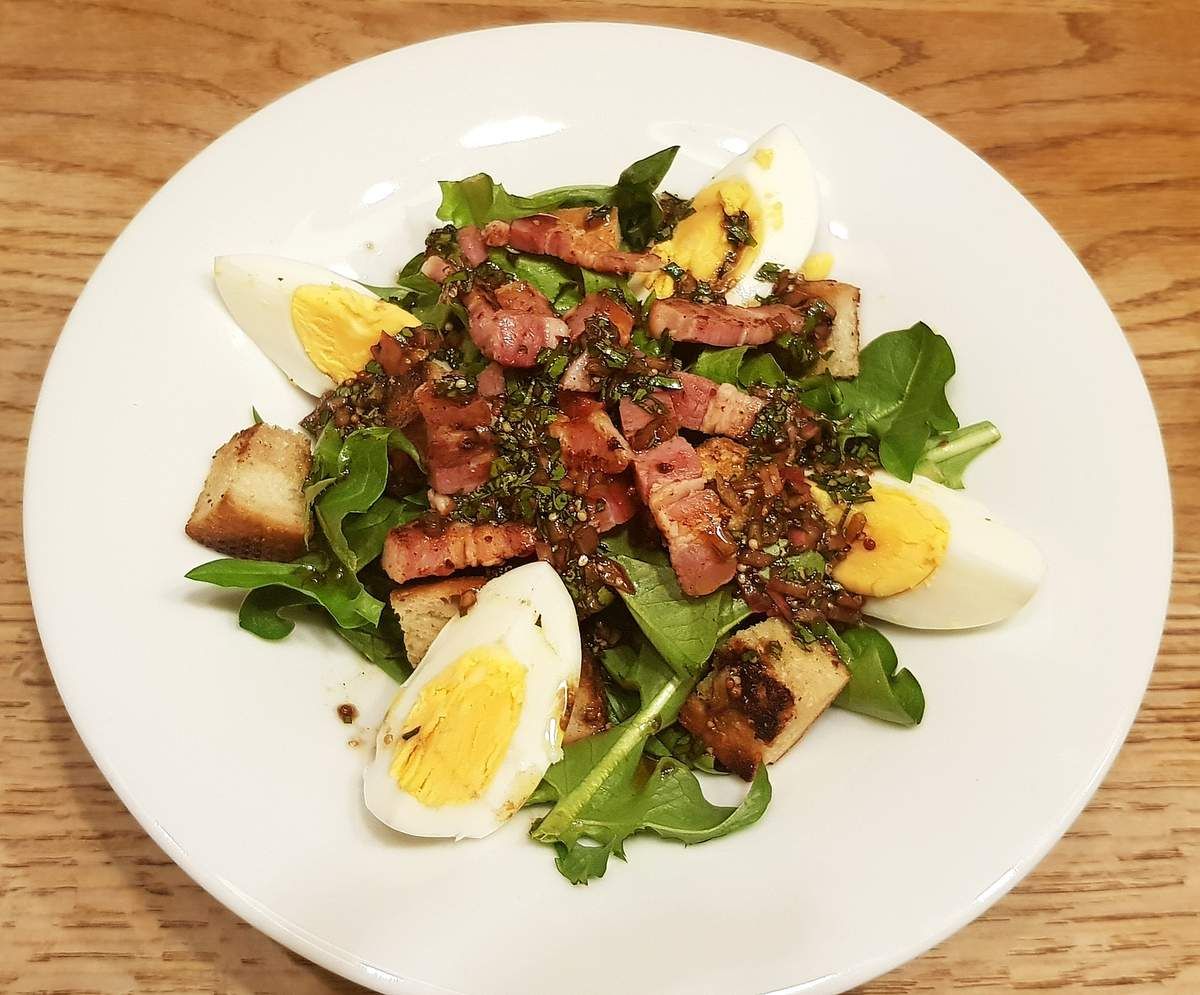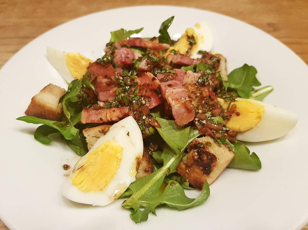Bien entendu, ce n'est pas une recette compliquée et vous l'avez sûrement déjà faite, cette salade. Lardons, croûtons, oeufs durs, la totale. Mais surtout, le plus important, une super vinaigrette.