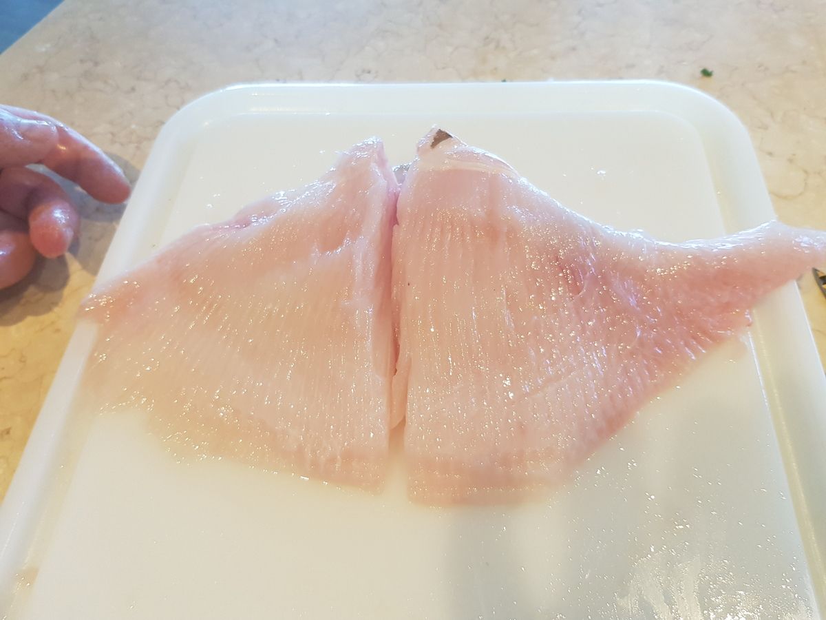 1) Rincer les raies parées (peau enlevée) à l'eau froide et les frotter doucement pour les nettoyer (de temps en temps, cela ne fait pas de mal...). Leur donner une jolie forme régulière et les couper en deux.