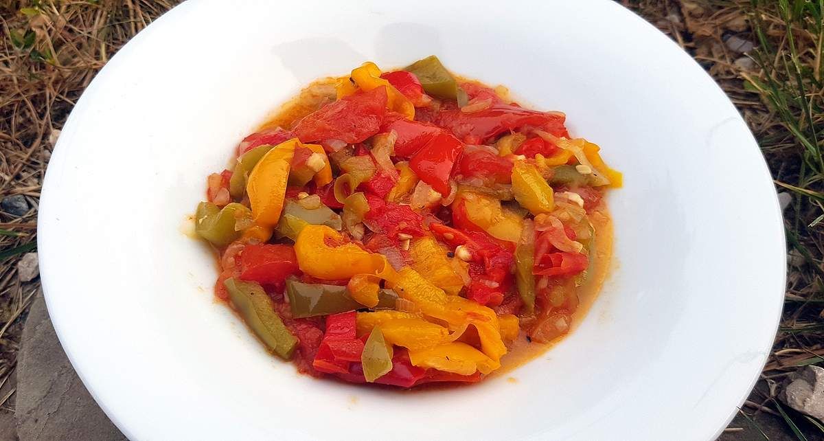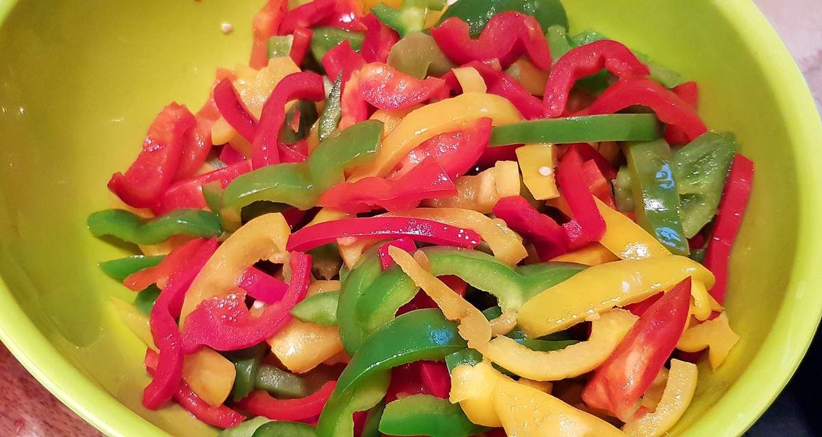 1) Eplucher les oignons, les couper en deux puis en lamelles. Peler les gousses d'ail et les hacher. Rincer les poivrons sous l'eau froide, les sécher puis les couper en deux. Retirer le centre avec les pépins et le pédoncule. Les couper en lanières. Rincer les tomates sous l'eau froide, les sécher puis les couper en deux, retirer le pédoncule et les couper en morceaux.