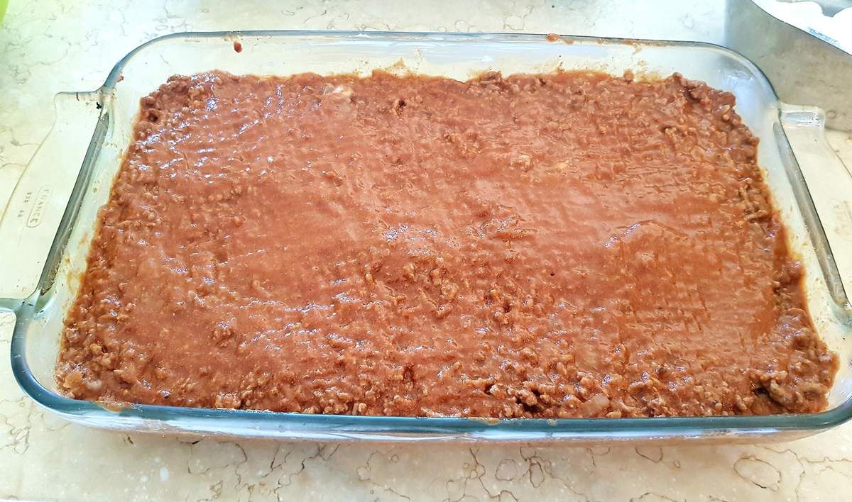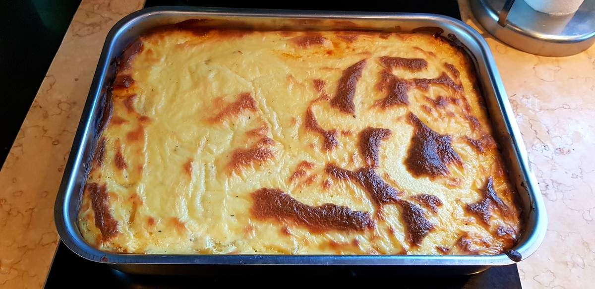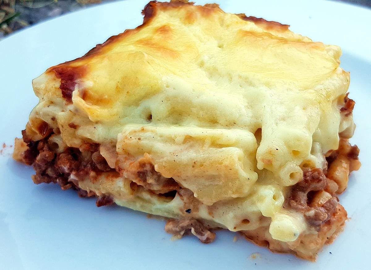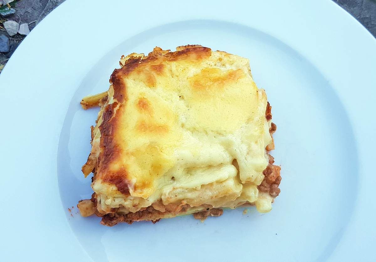 Une sauce faite de viande d'agneau et de boeuf, de coulis de tomate, épicée comme il faut avec un peu de cannelle, et lentement mijotée. Une béchamel onctueuse et épaisse (on y ajoute des jaunes d'oeufs pour lui donner cette consistance particulière). Et des macaronis. Sans oublier le fromage.