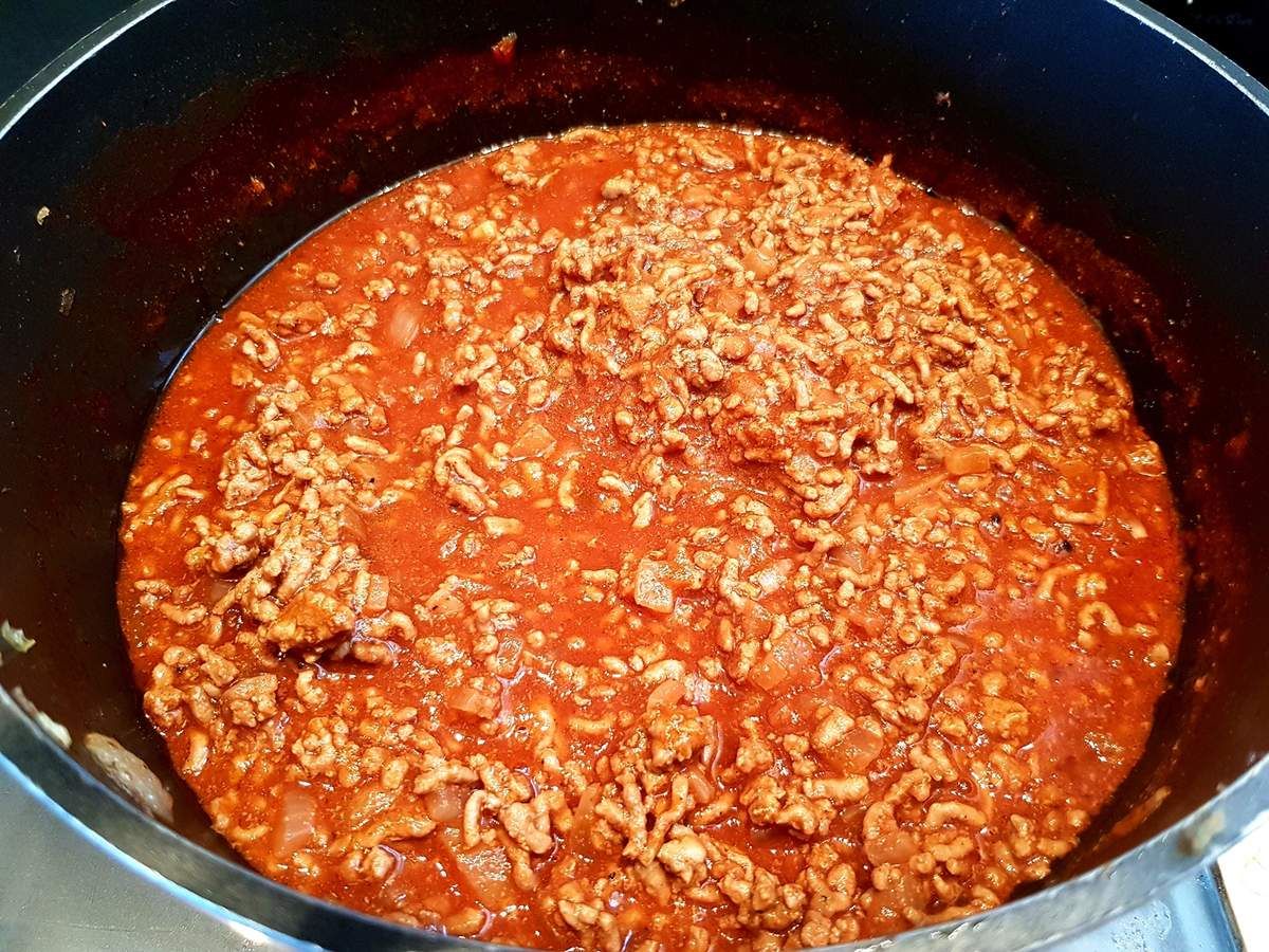 1) Peler et hacher l'oignon. Le faire revenir une minute dans une cocotte avec un peu d'huile d'olive. Ajouter les viandes. Faire revenir le tout en mélangeant pendant 10 minutes jusqu'à ce que la viande soit dorée.