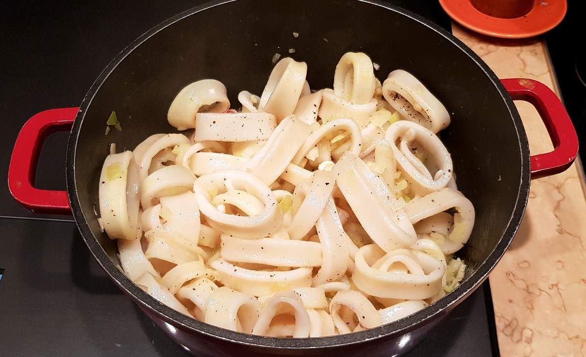 3) Dans une poêle haute ou dans un faitout, mettre à chauffer un filet d'huile d'olive puis faire revenir l'ail et l'oignon sur feu moyen-vif 2 minutes en mélangeant. Ajouter les anneaux de calamars, poivrer et mélanger. Faire revenir sur feu moyen-vif 5 minutes.