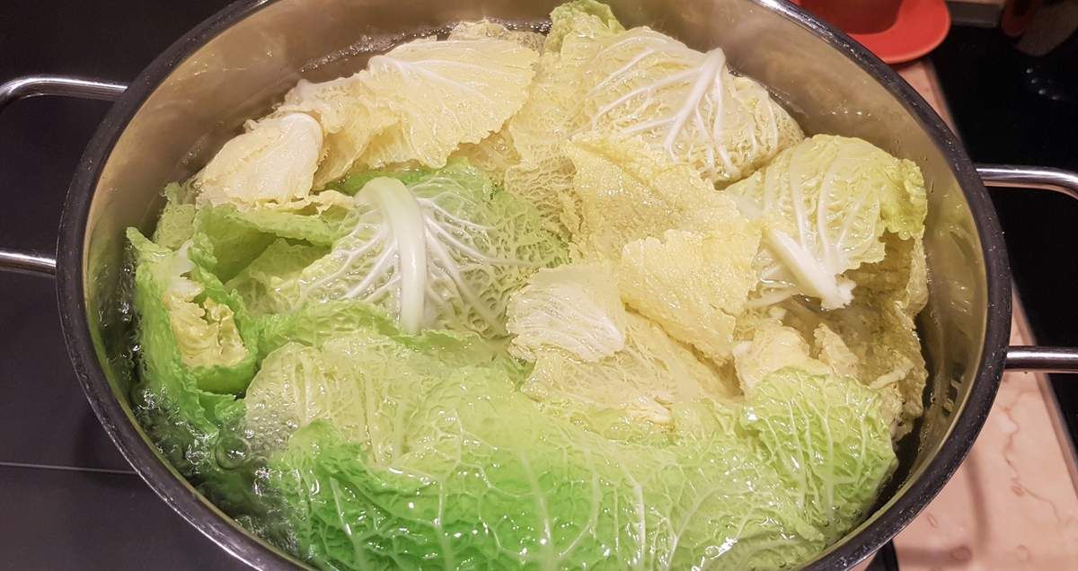 1) Enlever les feuilles extérieures du chou qui sont abîmées ainsi que le tronc puis détacher les feuilles une à une. Les plonger dans une casserole d'eau bouillante durant 5 minutes. Egoutter les feuilles de chou dans une passoire et les rincer à l'eau bien froide. Laisser tiédir.